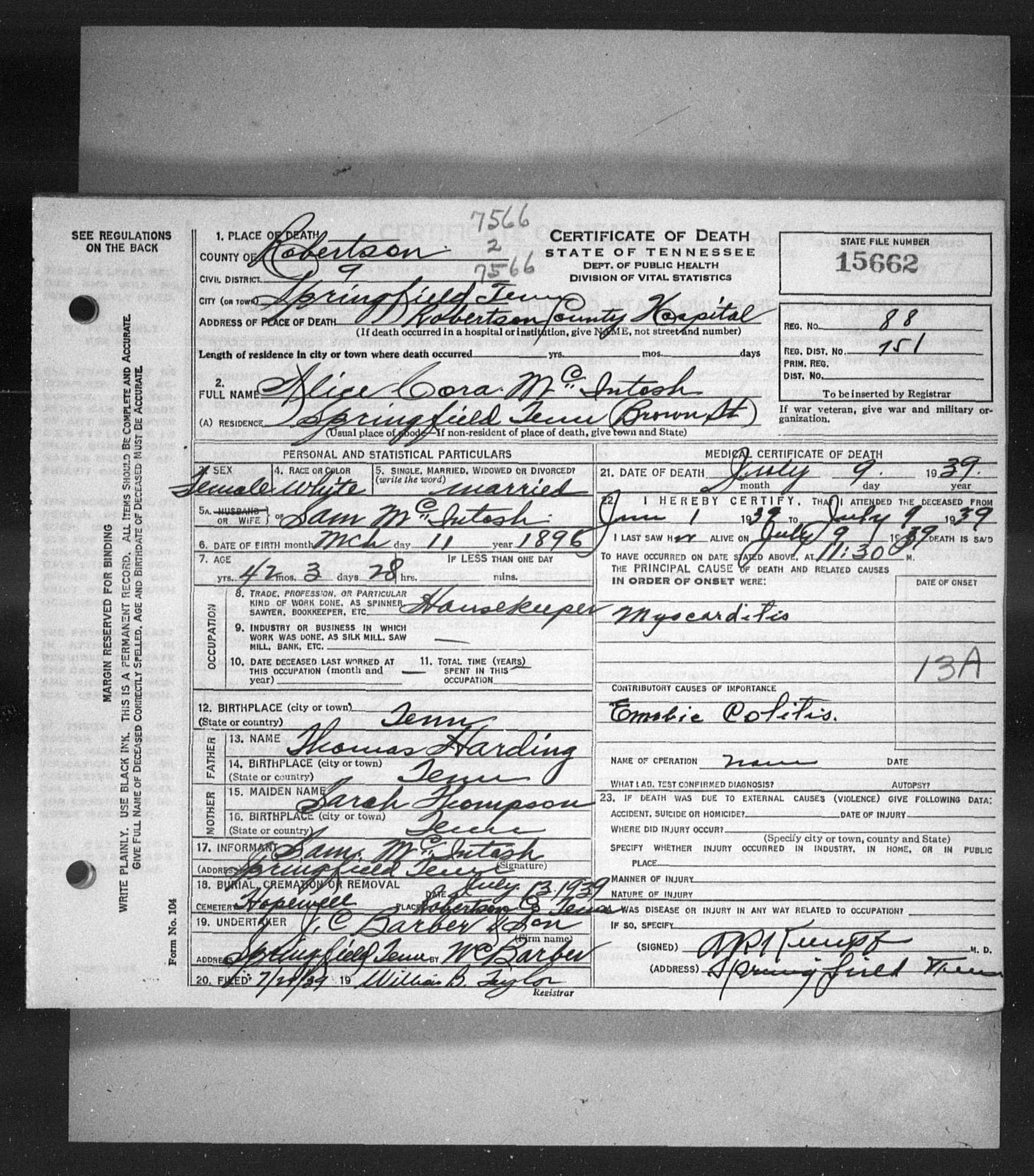 5108. Alice Cora Harden McIntosh, “Tennessee Death Records, 1914-1955,” microfilm, digital folder number: 4183673-image number: 740-film number: 1876877-volume/page/certificate number: cn 15662, https://familysearch.org/pal:/MM9.1.2/M14M-GDK/p3.
