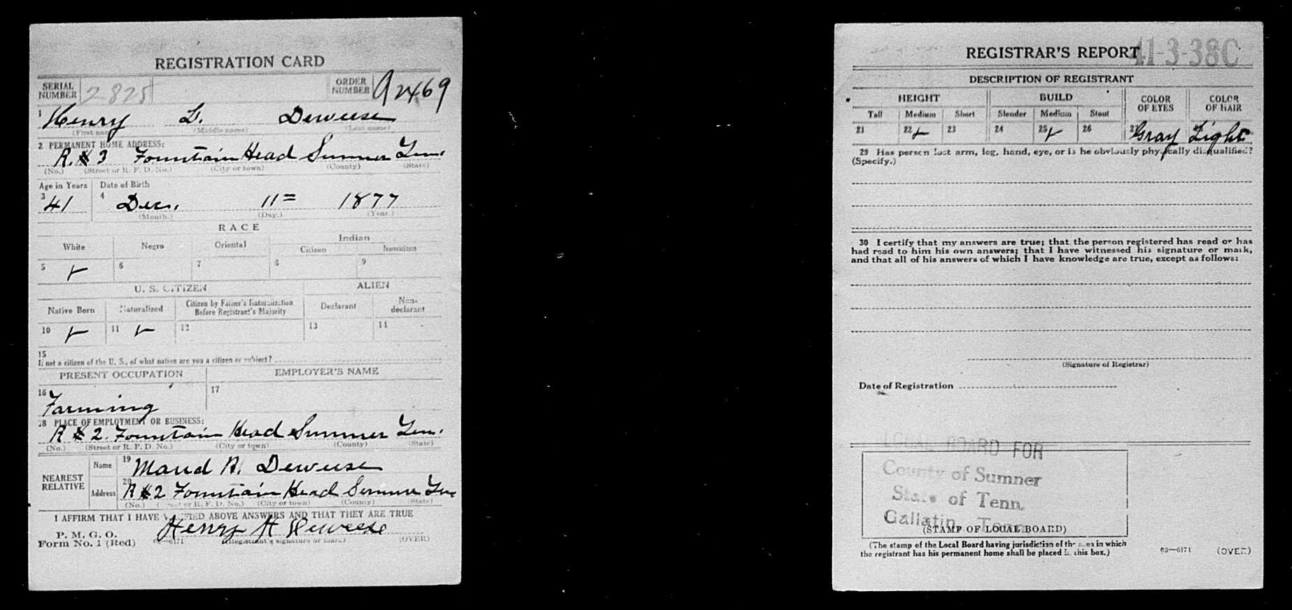 5121. Deweese, Henry L, World War I, 1917, TN, 2825, “United States World War I Draft Registration Cards, 1917-1918,” June 5, 1917, Gallatin, Sumner County, TN, https://www.familysearch.org/ark:/61903/1:1:KZ65-Q8S.