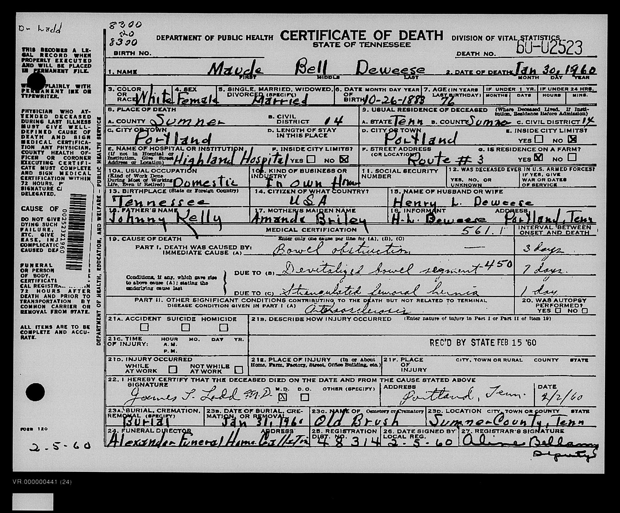 5123. Maude Bell Deweese, “Tennessee Death Records, 1914-1963,” January 30, 1960, Portland, Sumner County, TN, https://www.familysearch.org/ark:/61903/1:1:QKMS-Q3DF.