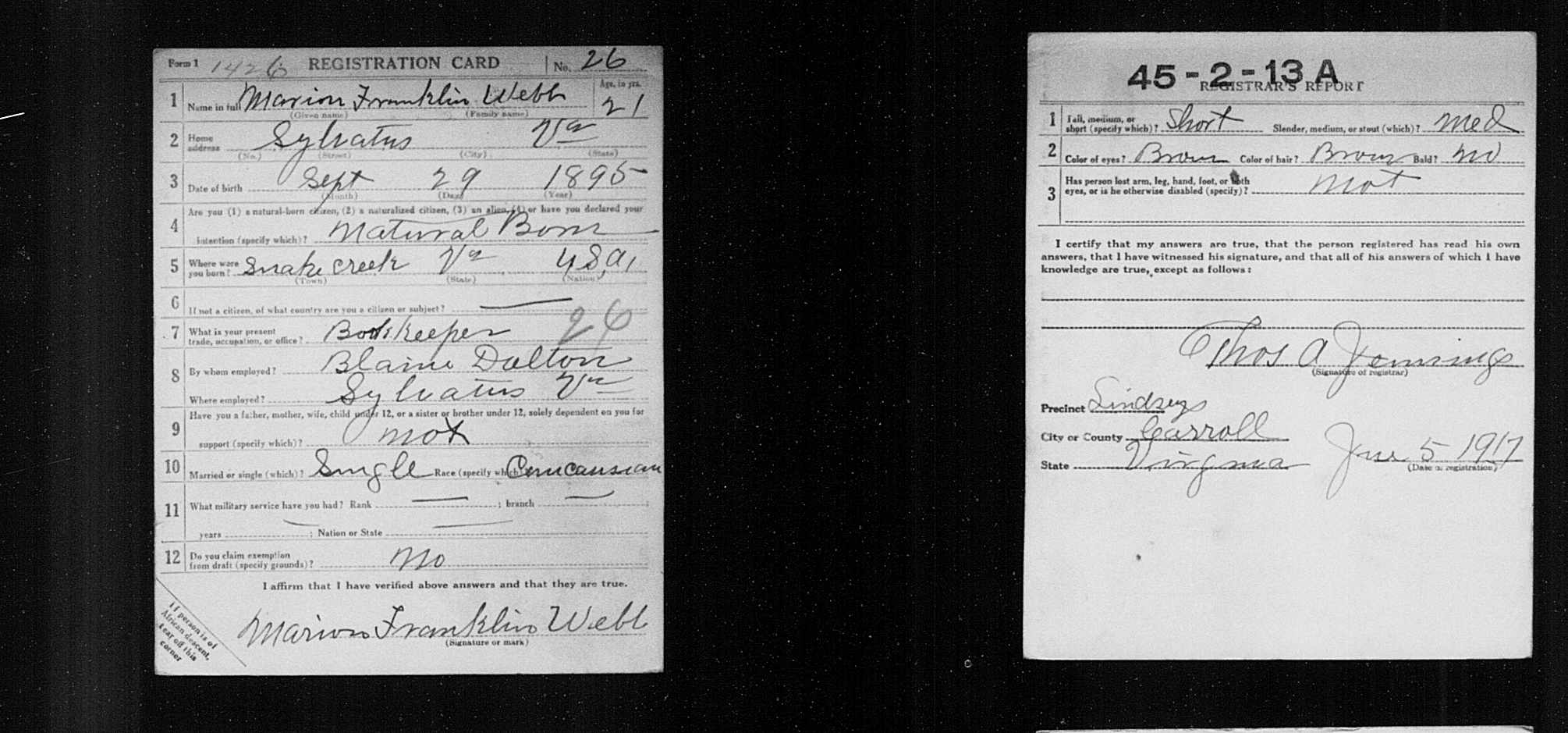 5149. World War I, 1917, Virginia, Webb, Marion Franklin, “World War I Selective Service System Draft Registration Cards,” June 5, 1917, Lindsey, Carroll County, VA, USA, Affiliate Publication Number: M1509-GS Film number: 1984613-Digital Folder Number: 005153678-Image Number: 04855, https://familysearch.org/pal:/MM9.1.1/K6CB-NRW.