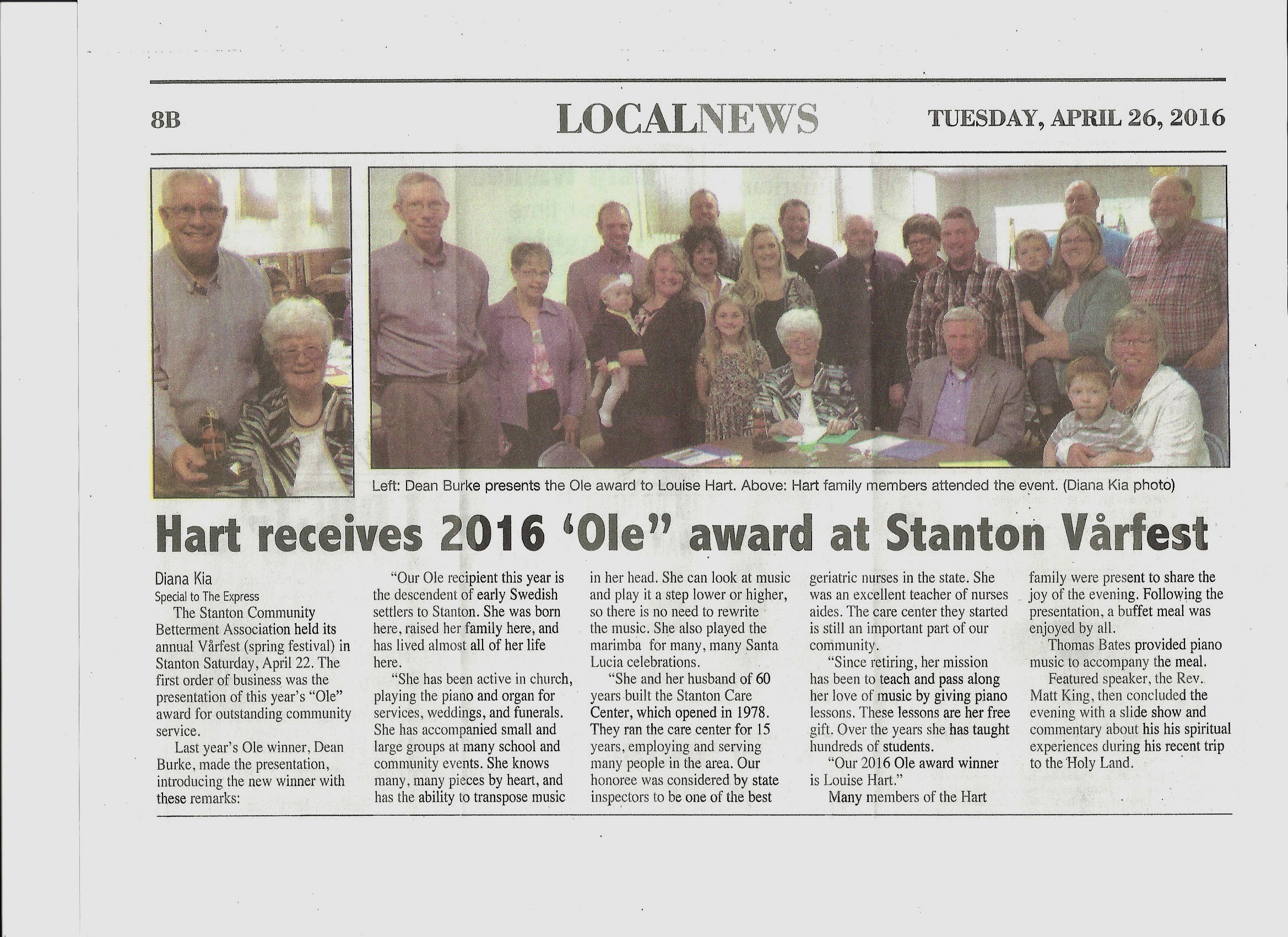 5235. “Hart receives 2016 ‘Ole” award at Stanton Vårfest,” Louise Hart, Red Oak Express, Stanton, IA, April 26, 2016, 8B.