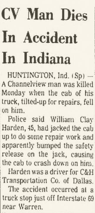 5502. “CV Man Dies In Accident In Indiana,” William Clay Harden, The Baytown Sun, Baytown, Harris County, TX, March 20, 1973, 7.