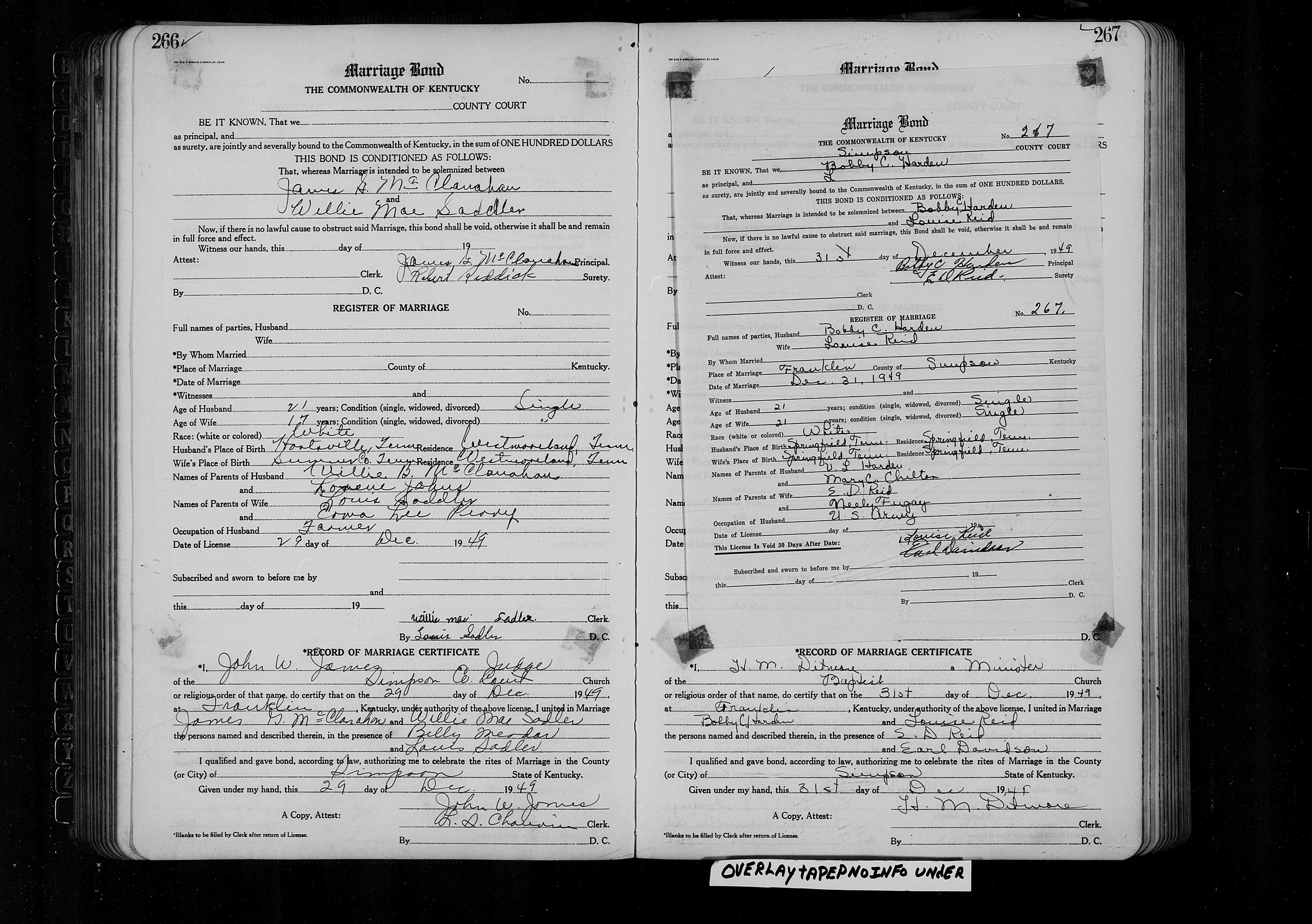 5510. Bobby C Harden and Louise Reid, “Kentucky, County Marriages, 1797-1954,” December 31, 1949, Franklin, Simpson County, KY, https://www.familysearch.org/ark:/61903/1:1:Q2D4-VVMG.
