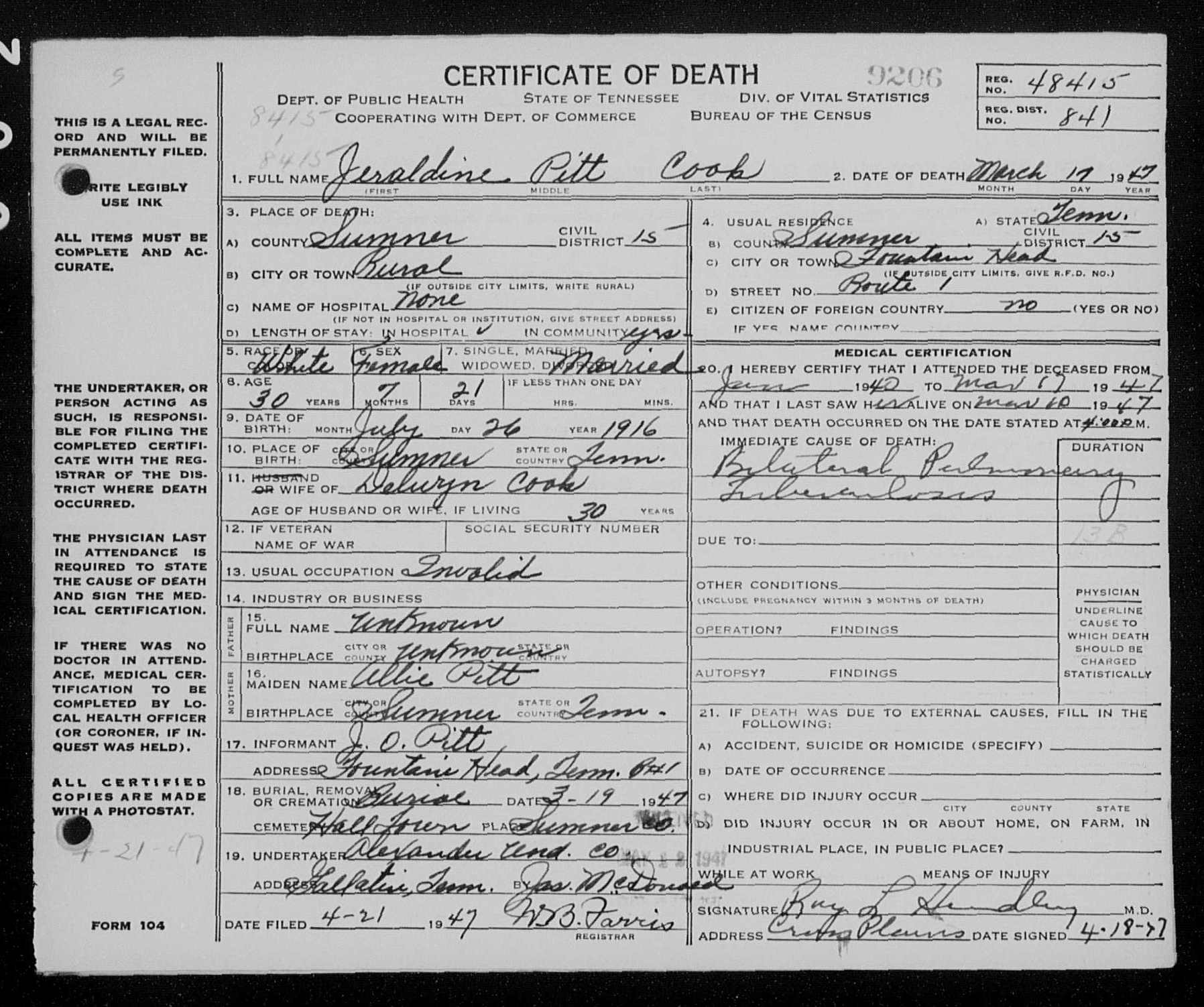 5551. Jeraldine Pitt Cook, “Tennessee Death Records, 1914-1963,” March 17, 1947, Sumner County, TN, https://www.familysearch.org/ark:/61903/1:1:N9LF-XFQ.