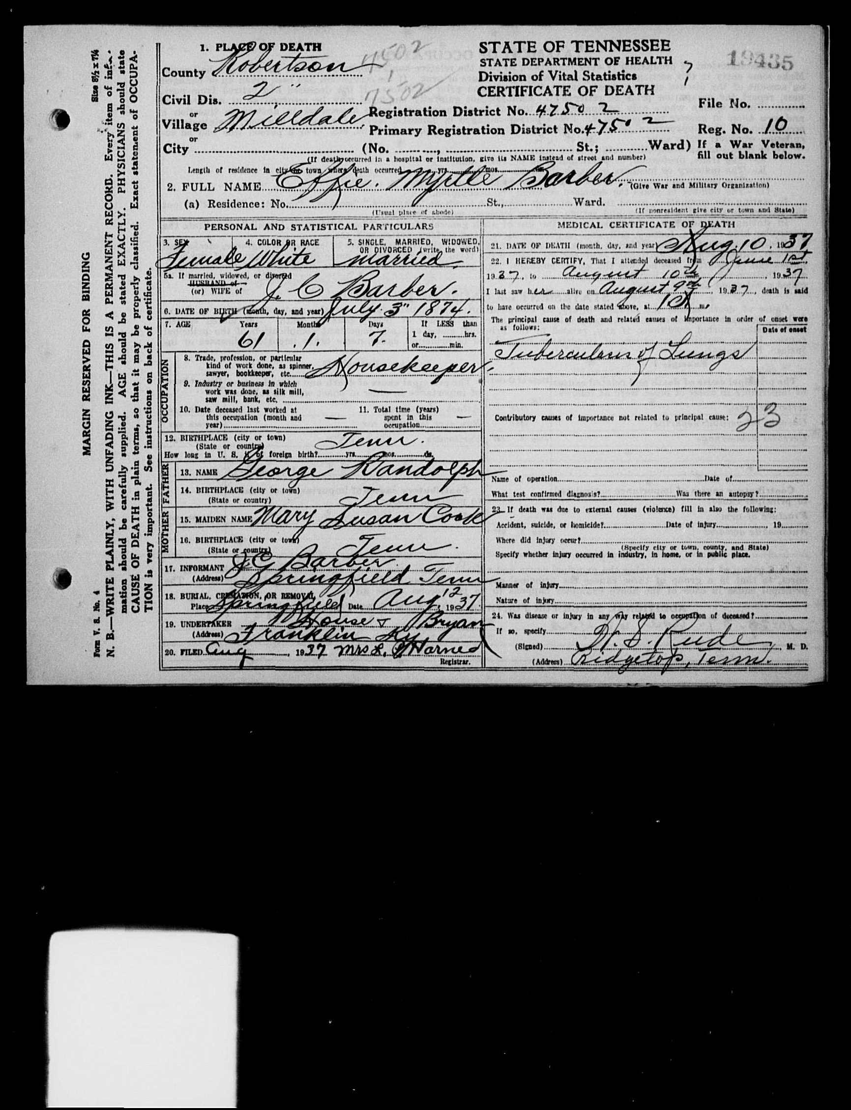 5564. Effie Myrtle Barber, “Tennessee Death Records, 1914-1955,” microfilm, digital folder number: 4183419-image number: 1961-film number: 1876853-volume/page/certificate number: cn 19435, https://familysearch.org/pal:/MM9.1.2/M1WB-JD9/p1.