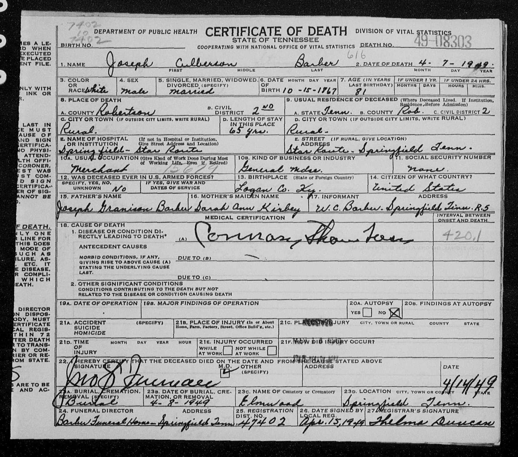 5565. Joseph Culberson Barber, “Tennessee Death Records, 1914-1955,” microfilm, digital folder number: 4184535-image number: 367-film number: 2218308-volume/page/certificate number: cn 49 08303, https://familysearch.org/pal:/MM9.1.2/M14Z-2K7/p1.