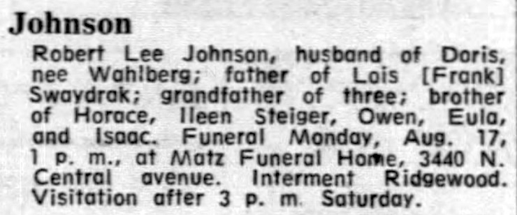 Robert Lee Johnson, husband of Doris, nee Wahlberg; father of Lois [Frank] Swaydrak; grandfather of three; brother of Horace, Ileen Steiger, Owen, Eual, and Isaac. Funeral Monday, Aug. 17, 1 p. m., at Matz Funeral Home, 3440 N. Central avenue. Interment Ridgewood. Visittation after 3 p. m. Saturday.