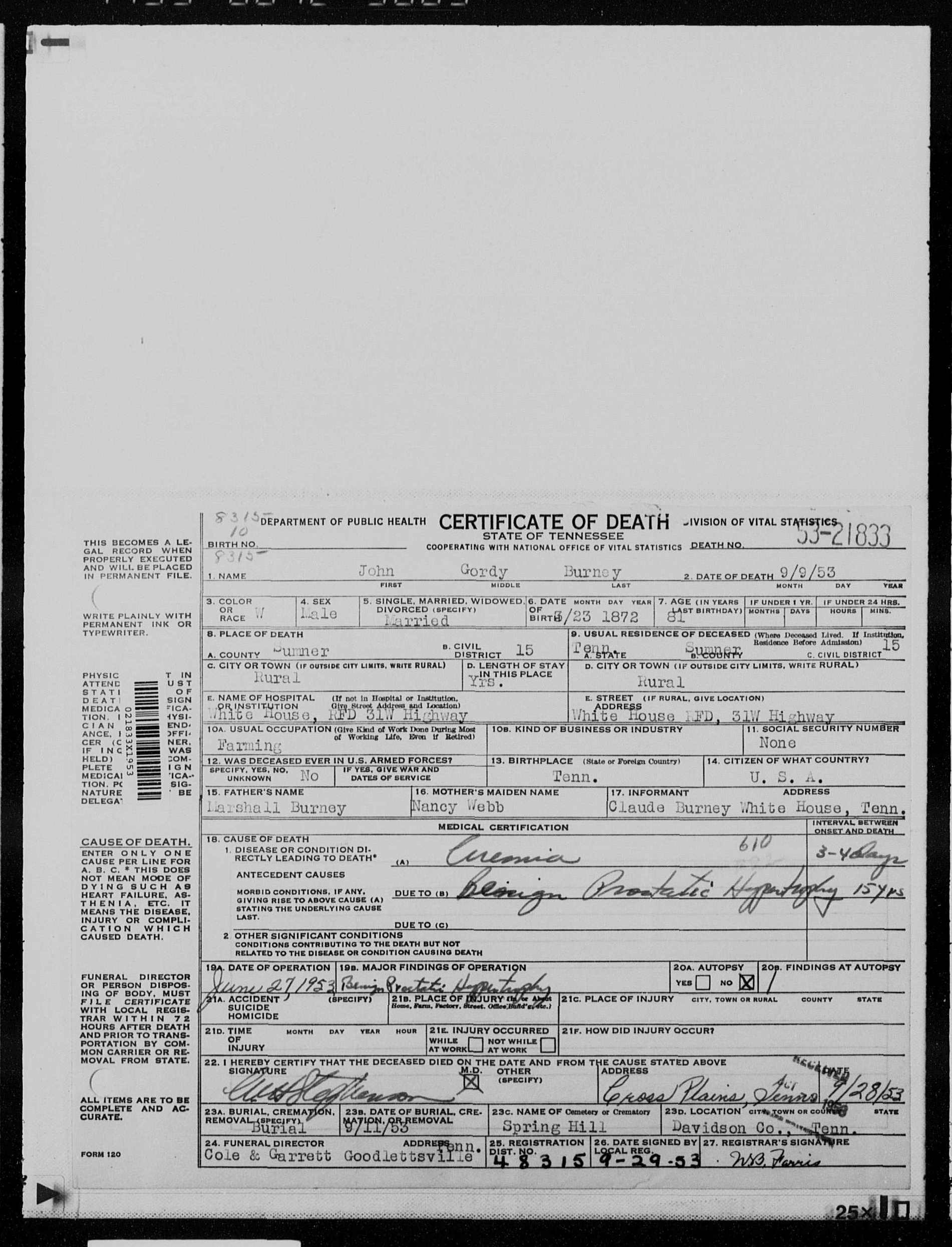 5591. John Gordy Burney, “Tennessee Death Records, 1914-1955,” microfilm, digital folder number: 4181498-image number: 3068-film number: 2372485, https://familysearch.org/pal:/MM9.1.2/M14F-XY4/p1.