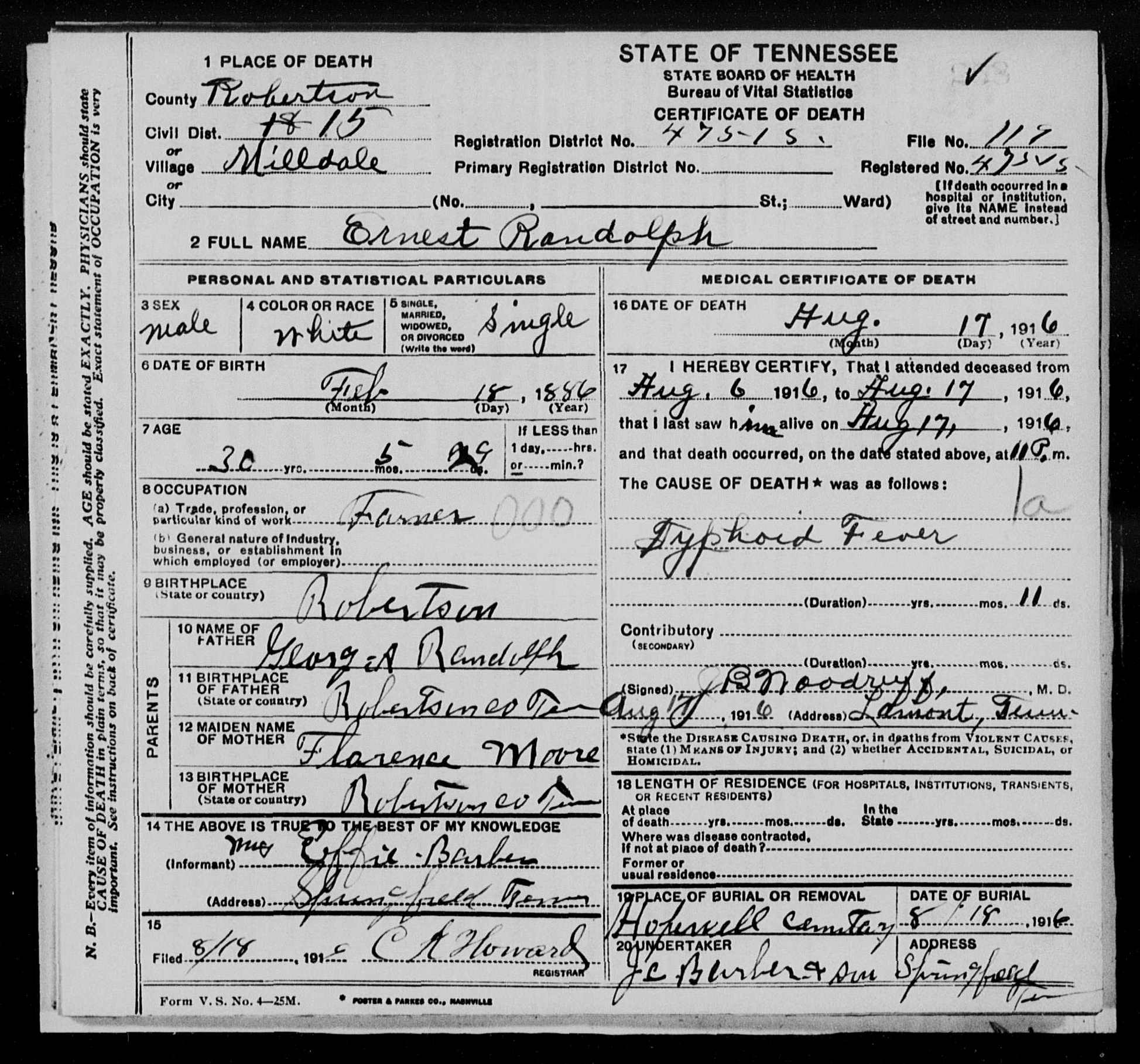 5652. Ernest Randolph, “Tennessee Death Records, 1914-1955,” microfilm, digital folder number: 4183053-image number: 1924-film number: 1299658-volume/page/certificate number: v 42 cn 258, https://familysearch.org/pal:/MM9.1.2/M17Y-55J/p1.