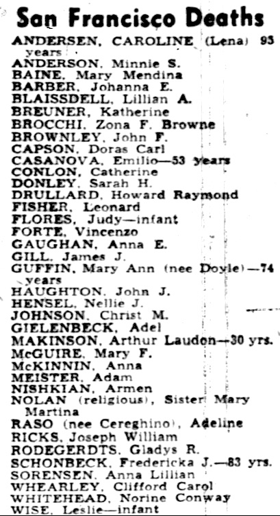 5657. “San Francisco Deaths,” Gladys R Rodegerdts, Oakland Tribune, Oakland, CA, January 31, 1949, 27.