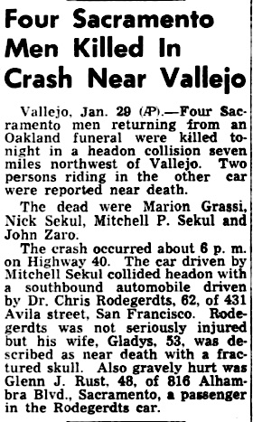 5658. “Four Sacramento Men Killed In Carsh Near Vallejo,” Dr. Chris Rodegerdts, Gladys Rust Rodegerdts, and Glenn J Rust, Santa Cruz Sentinel, Santa Cruz, CA, January 30, 1949, 1.