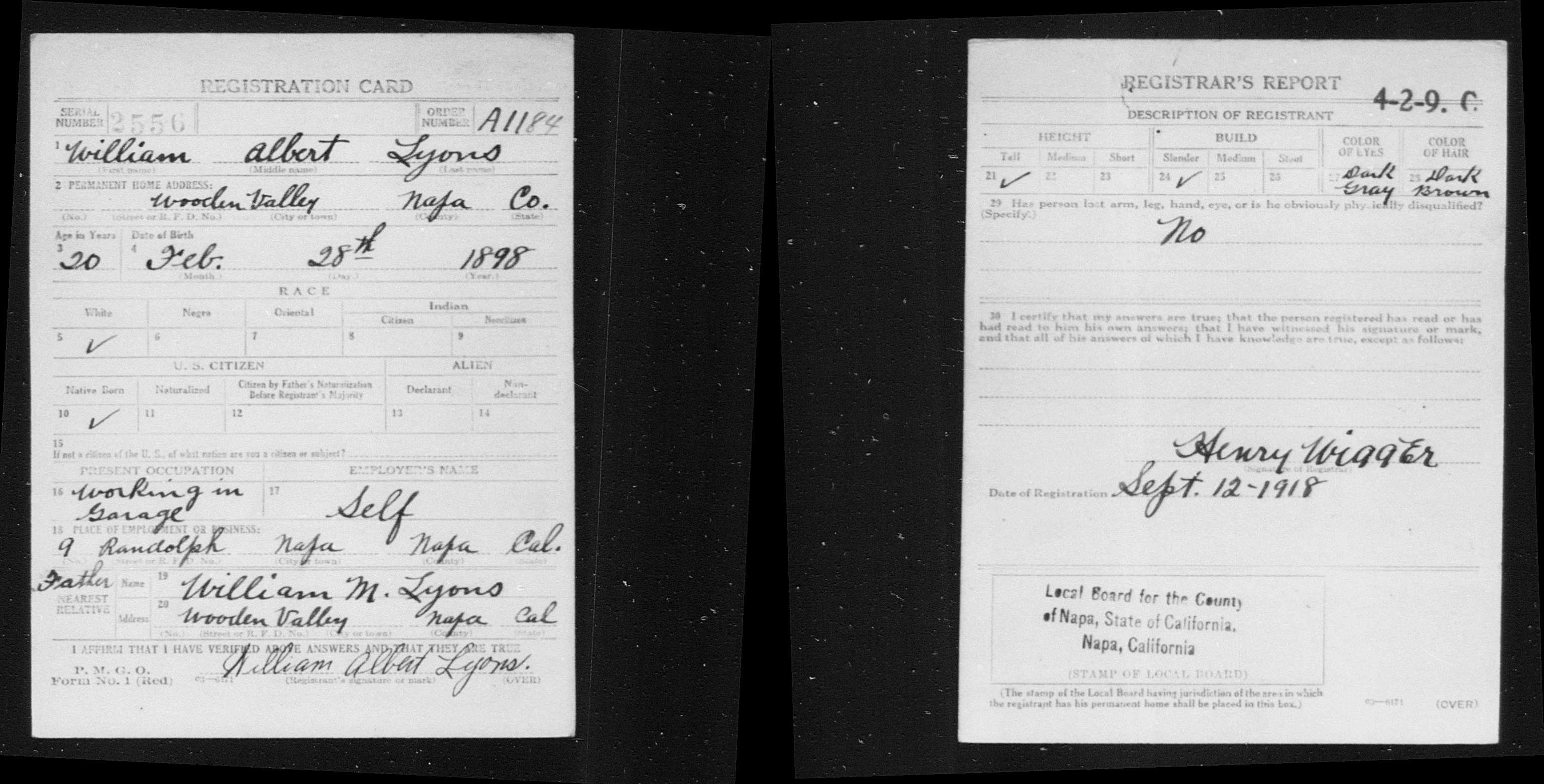 5662. World War I, 1918, California, 2556, Lyons, William Albert, “World War I Selective Service System Draft Registration Cards,” September 12, 1918, Napa, Napa County, CA, USA, Affiliate Publication Number: M1509-GS Film number: 1531206-Digital Folder Number: 005240949-Image Number: 01698, https://familysearch.org/pal:/MM9.1.1/KZVL-TTD.