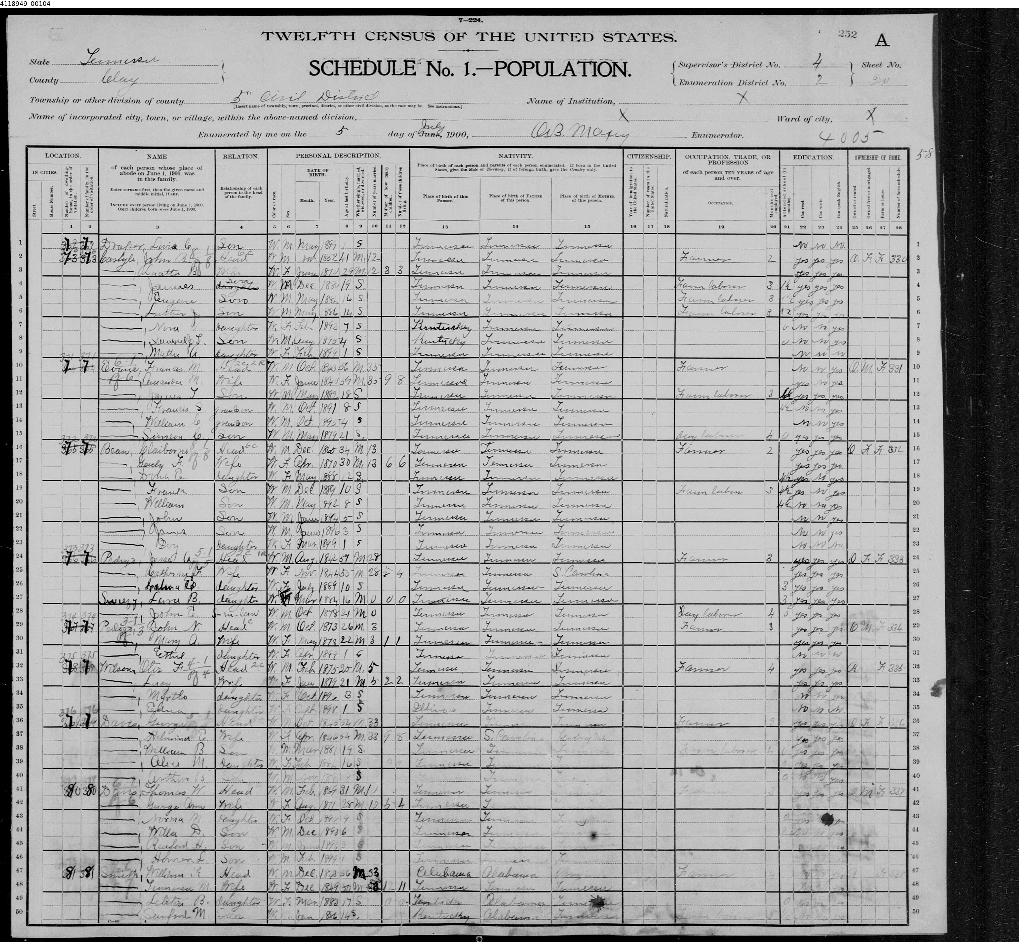 5674. “United States Census,” 1900, TN, Clay, District 05, 20A-20B, 4, 2, T623, 1241562, 30, 104, Bureau of the Census, US Dept. of Commerce, United States of America, July 5, 1900, A B Maxey.