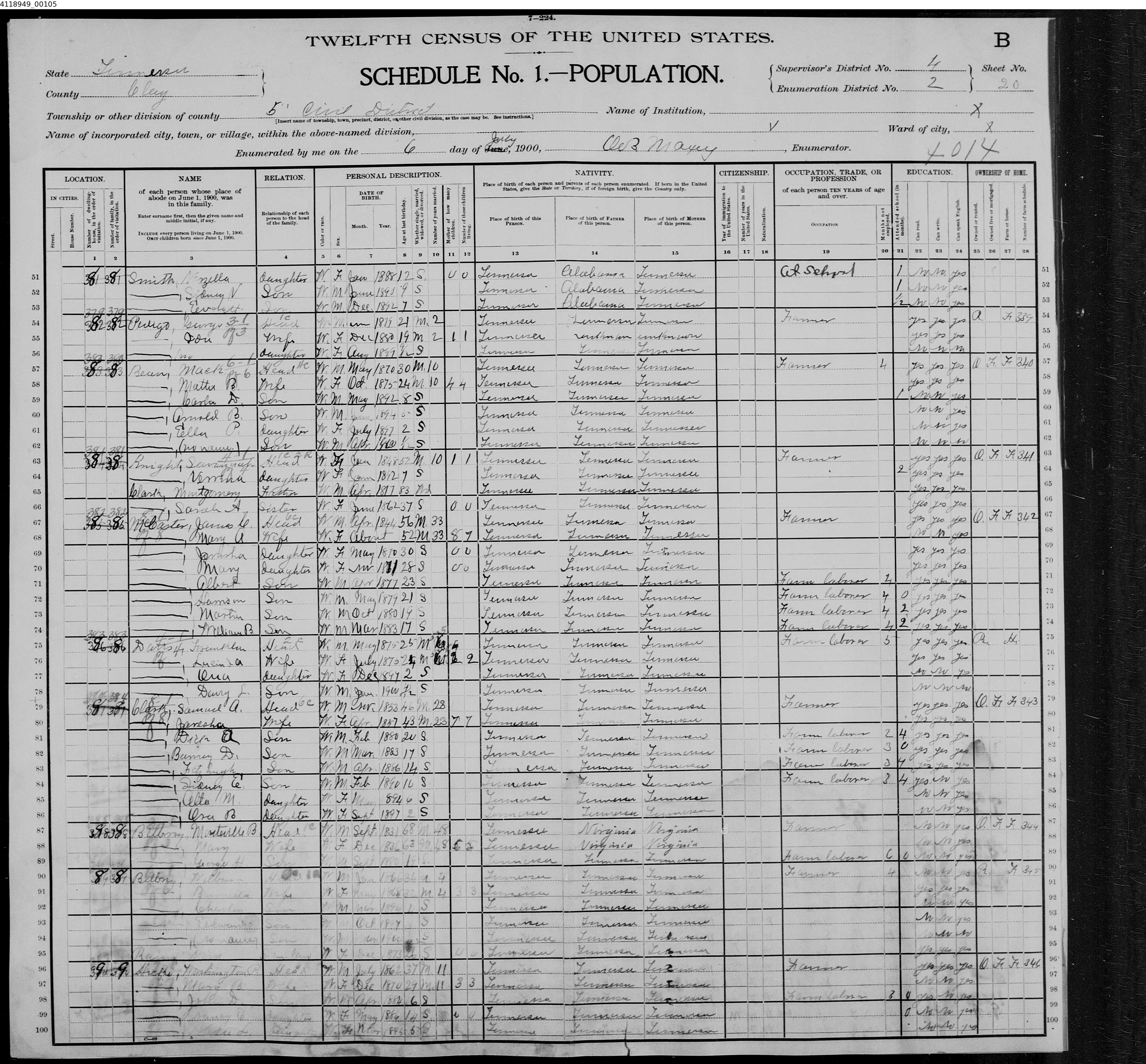 5661. “United States Census: 1900,” Bureau of the Census, US Dept. of Commerce, United States of America, 1900, TN, Macon, District 04, June 6-7, 1900, Alex W. Jenkins, 3B, 4, 35, T623, 1586, 234, Name is very hard to read. Starts with P I think.