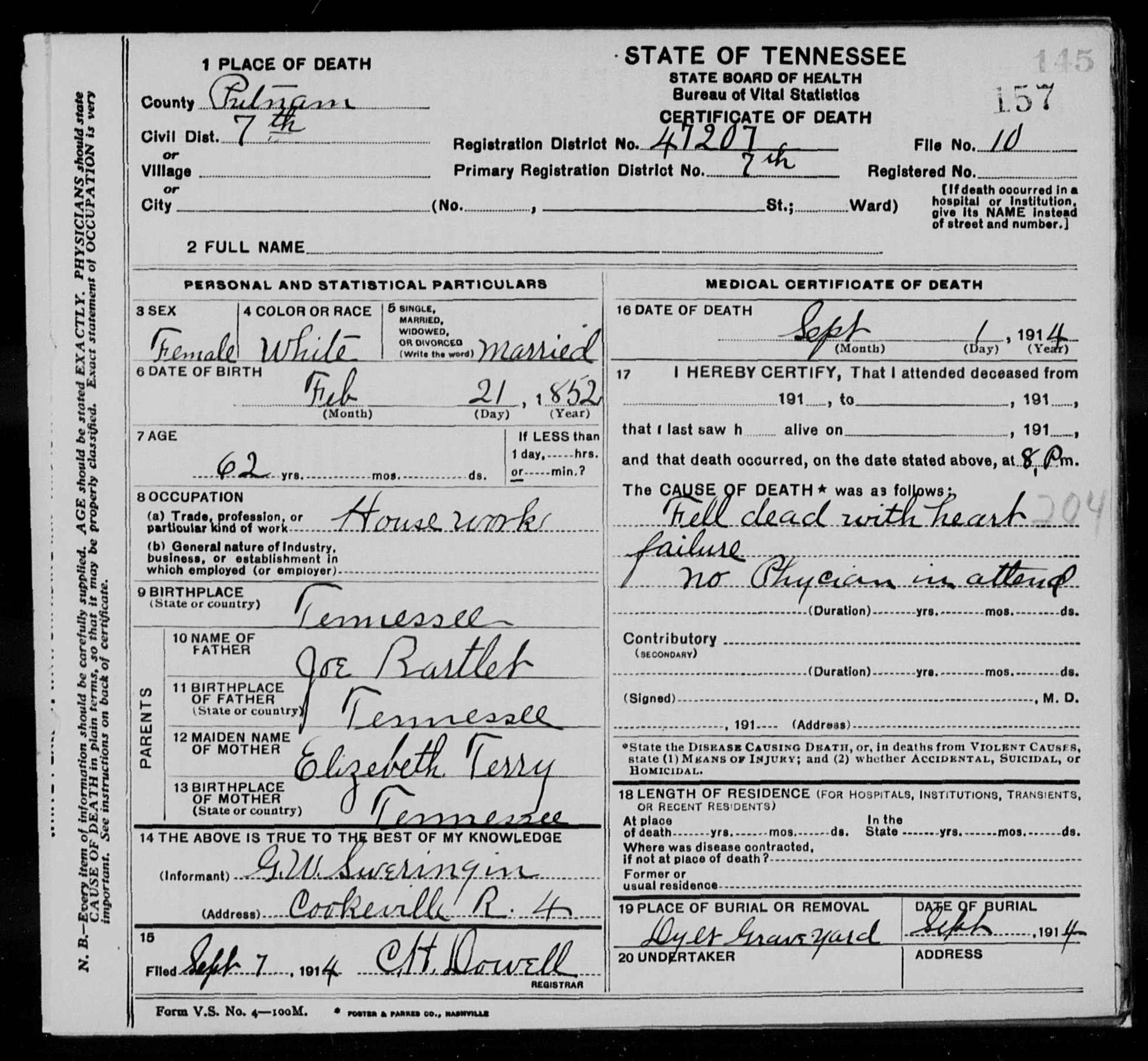 5678. Clerissa Bartlett, “Tennessee Death Records, 1914-1955,” microfilm, digital folder number: 4183023-image number: 2030-film number: 1299627-volume/page/certificate number: v 43 cn 145, https://familysearch.org/pal:/MM9.1.2/9XY1-255/p1.