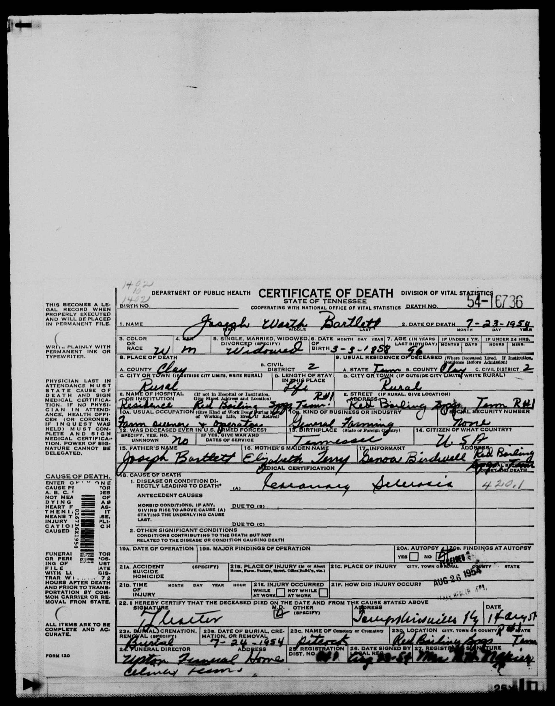 5679. Joseph Worth Bartlett, “Tennessee Death Records, 1914-1955,” Clay County, TN, USA, microfilm, digital folder number: 4181428-image number: 310-film number: 1343066-volume/page/certificate number: cn 16736, https://familysearch.org/pal:/MM9.1.1/NSPL-388.