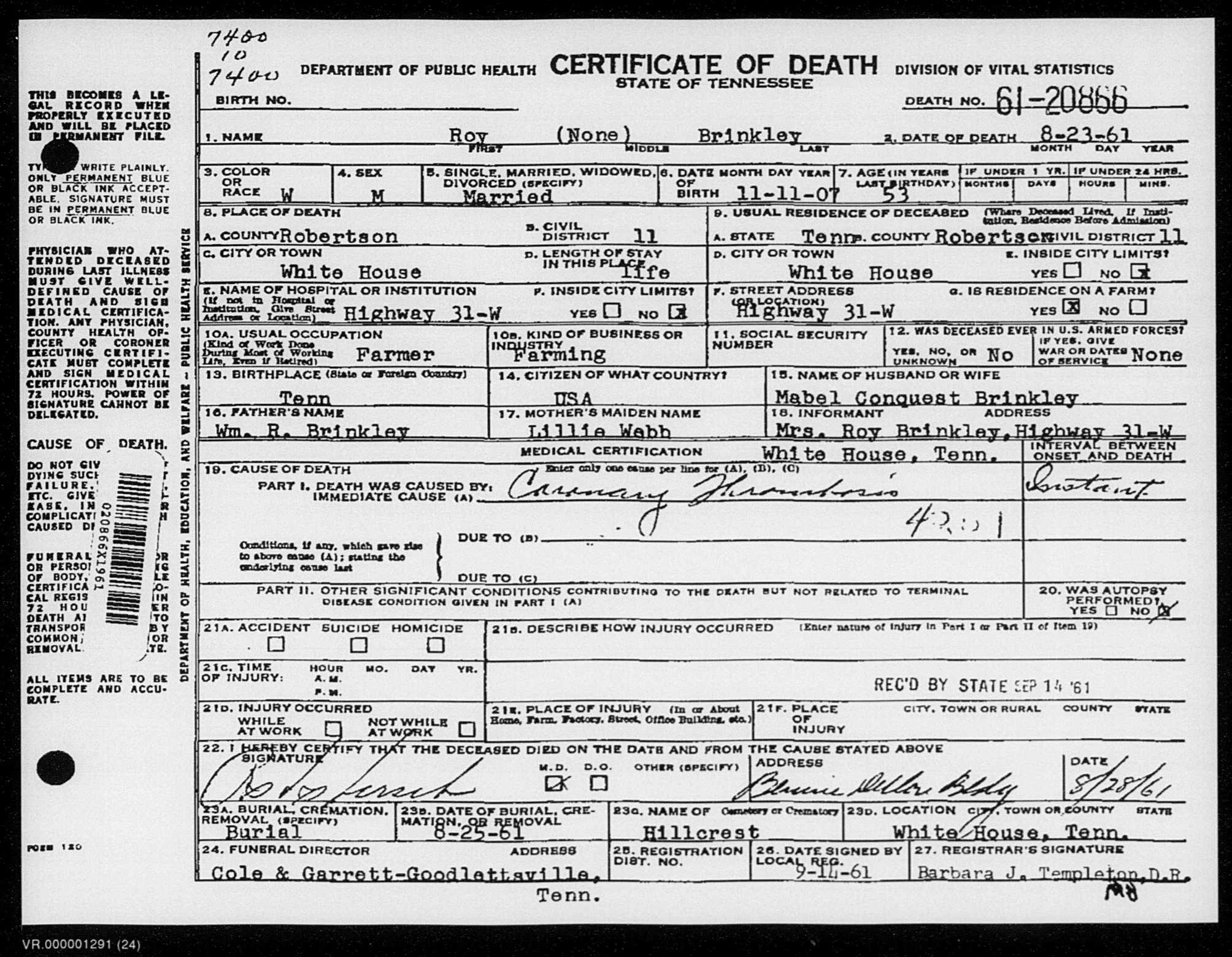 5692. Roy (None) Brinkley, “Tennessee, Death Records, 1914-1955,” August 23, 1961, White House, Robertson County, TN, USA, GS Film Number 001973347-Digital Folder Number 007552558-Image Number 01298, https://familysearch.org/ark:/61903/1:1:QKMS-6V24.