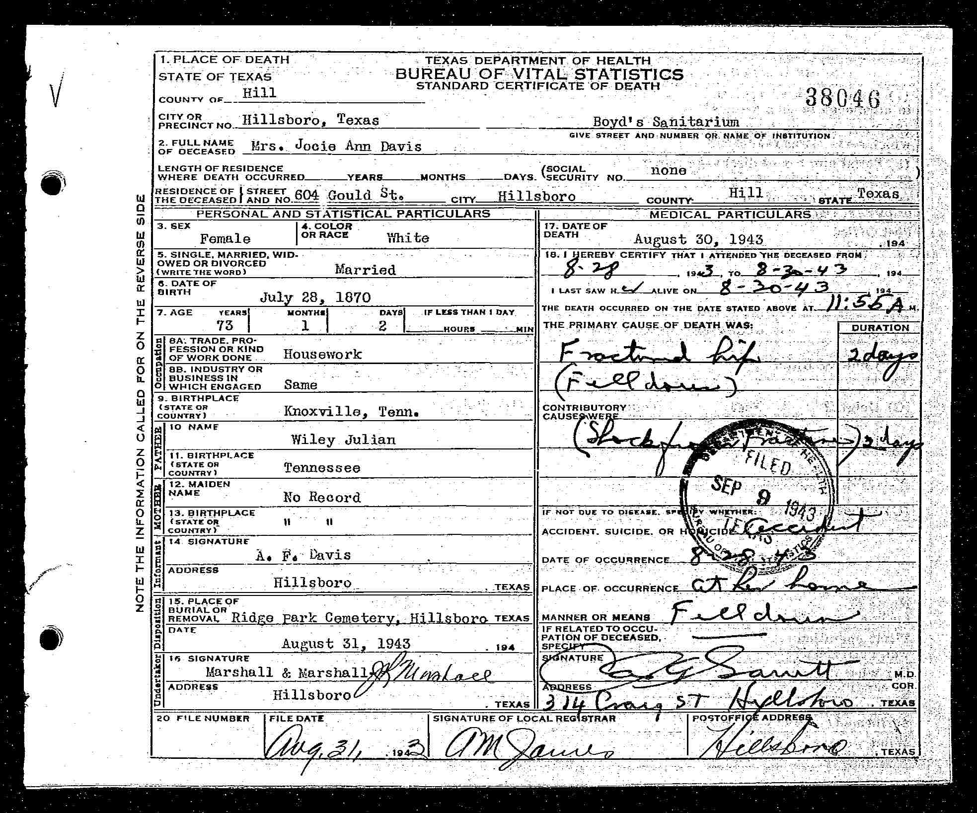 5719. “United States Census: 1920,” Bureau of the Census, US Dept. of Commerce, United States of America, 1920, TX, Hill, Justice Precinct 01, January 28, 1920, L T Mitchell, 13A, 6, 33, T625, 1818, 42, Gives name as William R Davis.