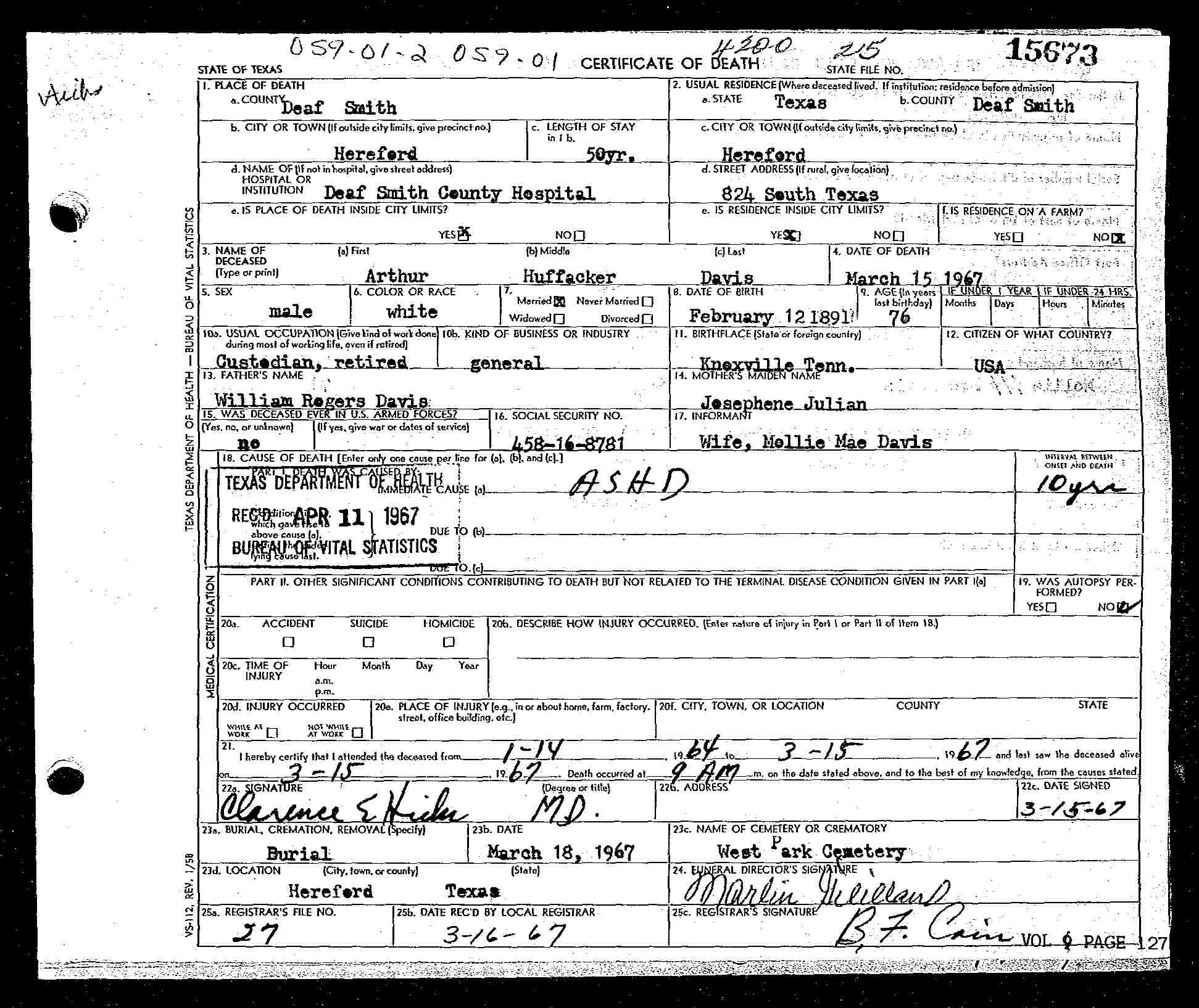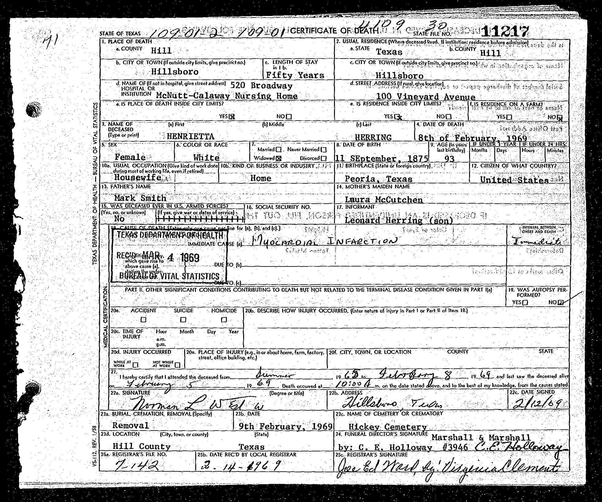 5712. “Ridge Park Cemetery,” http://www.rootsweb.ancestry.com/~txhcgs/RidgeParkDa.htm, Gives birth date as July 28, 1874.
