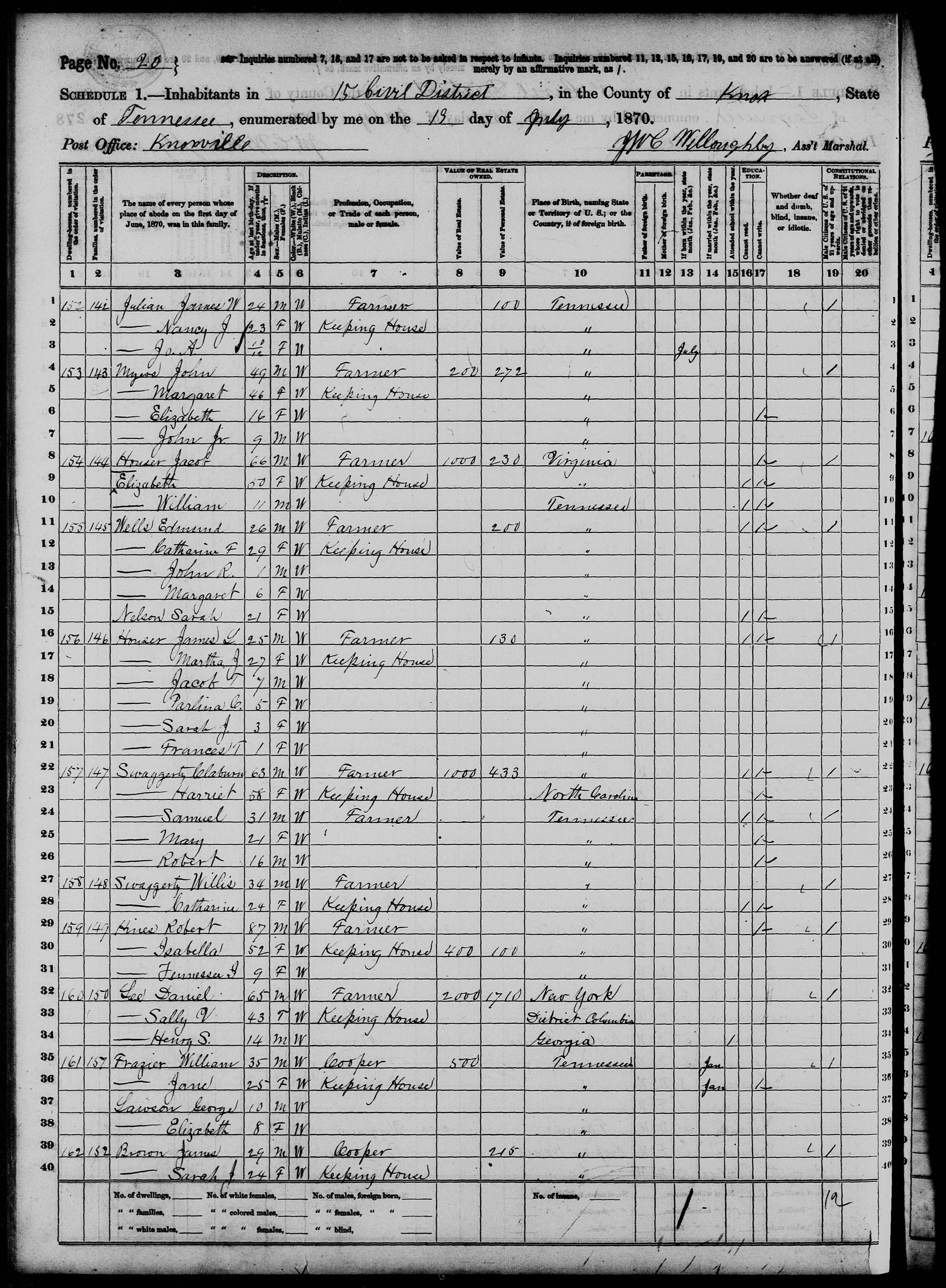 5716. “Ninth Census of the United States. Schedule No. 1.--Population,” Bureau of the Census, US Dept. of Commerce, United States of America, 1870, TN, Knox, District 15, Knoxville, July 19, 1870, J W C Willoughby, 20, M593, 1541, 278.