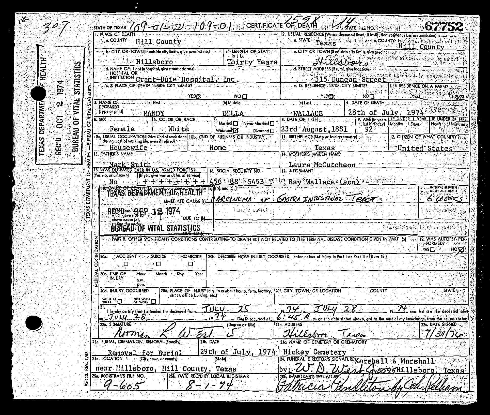 5732. “Mandy Della Smith Wallace,” Find-A-Grave, https://www.findagrave.com/memorial/39933143, 39933143, Name on tombstone is Della M Wallace.