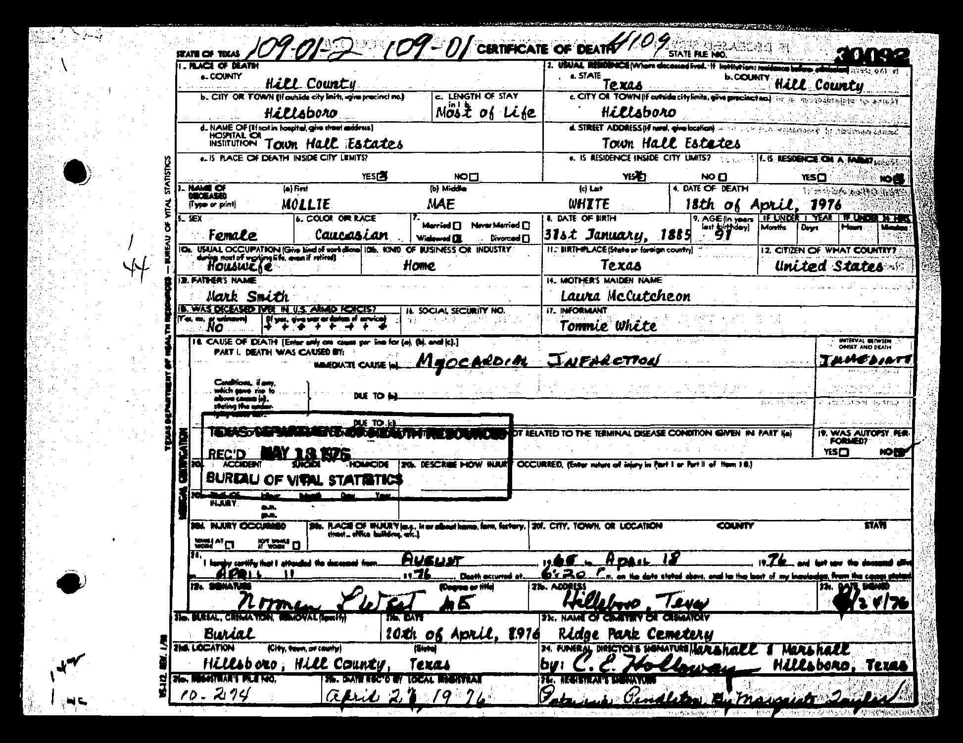 5725. “United States Census: 1930,” Bureau of the Census, US Dept. of Commerce, United States of America, 1930, TX, Hill, Hillsboro, Third Ward, Justice Precinct 01, April 4, 1930, Mrs. Minnie K Meluaffey, 6B, 109-4, 15, T626, 2357, 65.