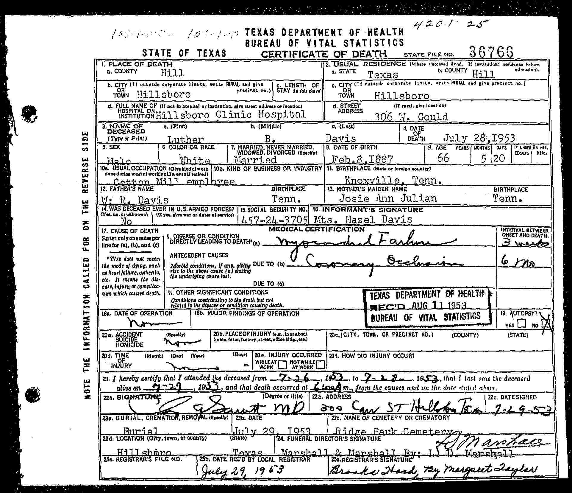 5780. Susan Elizabeth Webb, “Tennessee Death Records, 1914-1955,” microfilm, digital folder number: 4184898-image number: 1376-film number: 2137358-volume/page/certificate number: cn 8692, https://familysearch.org/pal:/MM9.1.2/M14W-83N/p1, Lists name as Martha Donelson.