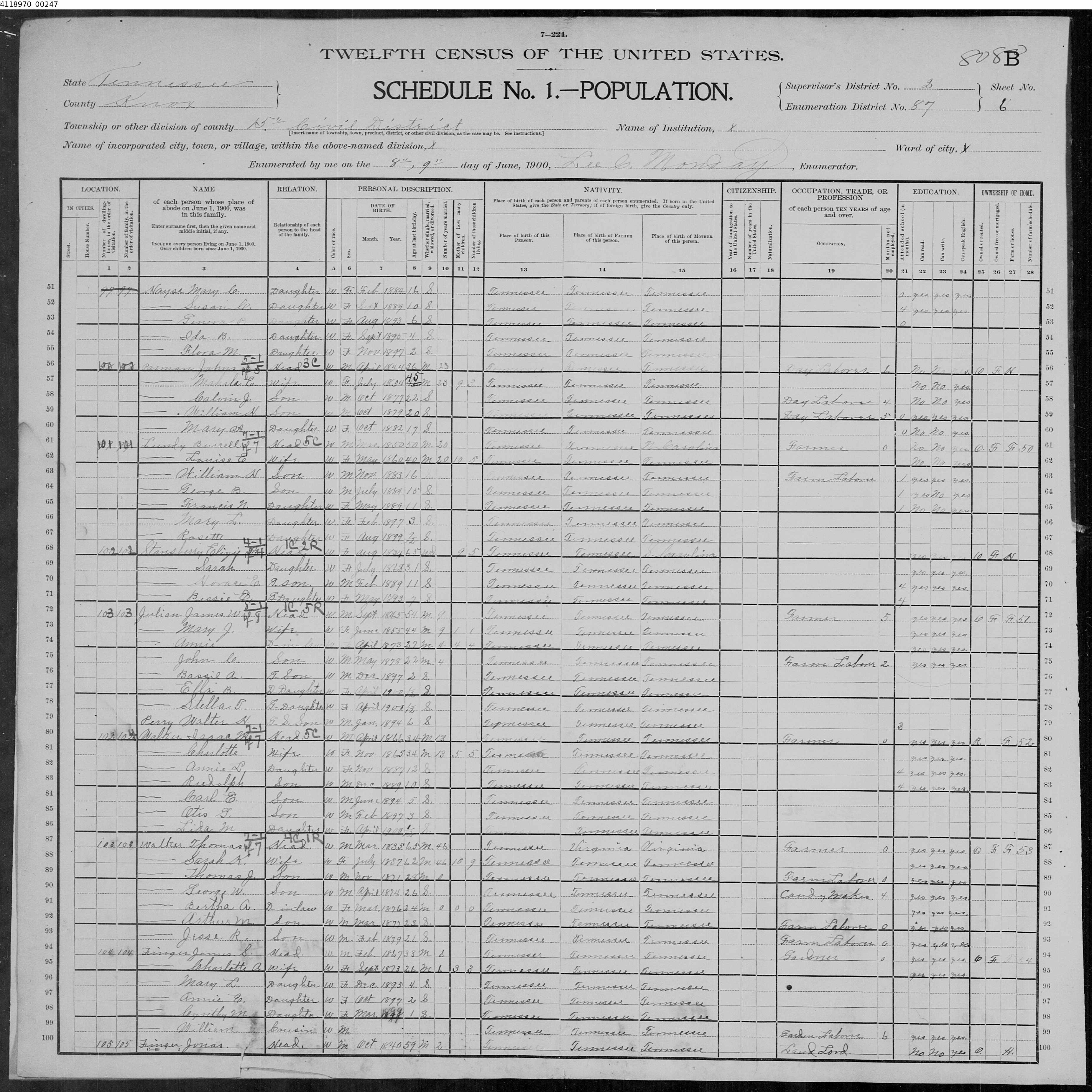 5758. “United States Census: 1900,” Bureau of the Census, US Dept. of Commerce, United States of America, 1900, TN, Knox, Civil District 15, June 2, 1900, Jas M Buckham, 6B, 2, 87, T623, 1583, 121.