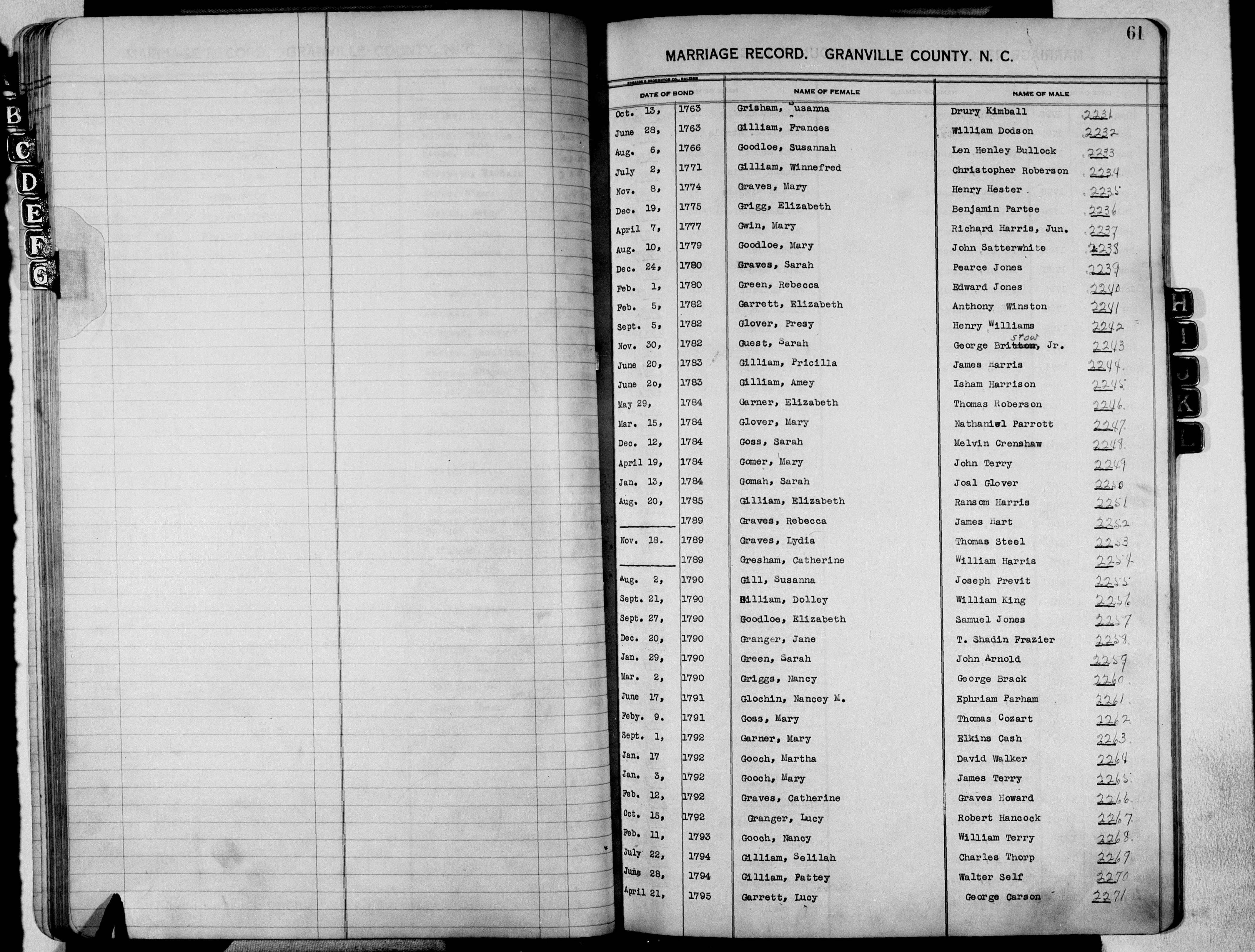 5770. James Terry and Mary Gooch, “North Carolina, County Marriages, 1762-1979,” January 3, 1792, Granville, NC, USA, GS Film number: 001758775-Digital Folder Number: 004364809-Image Number: 00051, https://familysearch.org/pal:/MM9.1.1/XFS3-K5V.