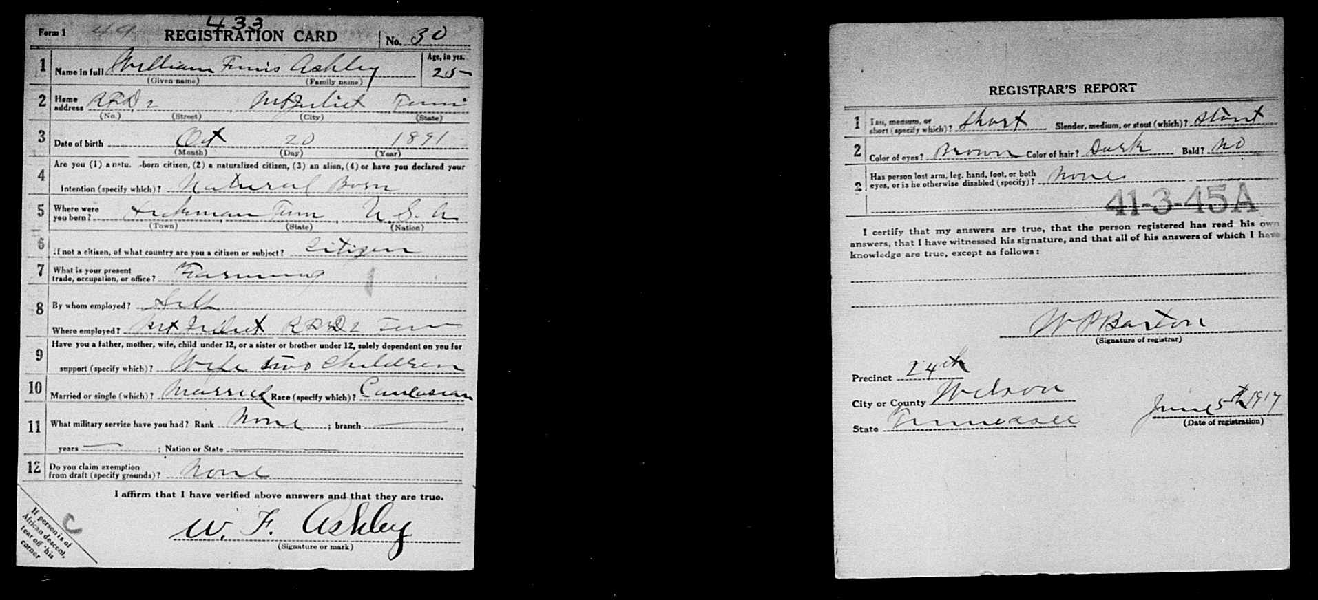 5772. World War I, 1917, TN, 30, Ashley, William Finnis, “World War I Selective Service System Draft Registration Cards,” June 5, 1917, Wilson County, TN, GS Film Number 1877749-Digital Folder Number 005152502-Image Number 04757, https://familysearch.org/ark:/61903/1:1:KZ6R-25X.