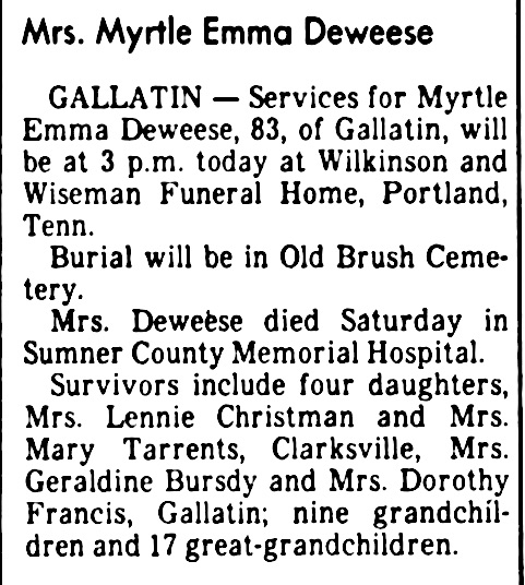 5800. “Obituaries,” Mrs. Myrtle Emma Deweese, The Tennessean, Nashville, TN, August 10, 1981, 8.