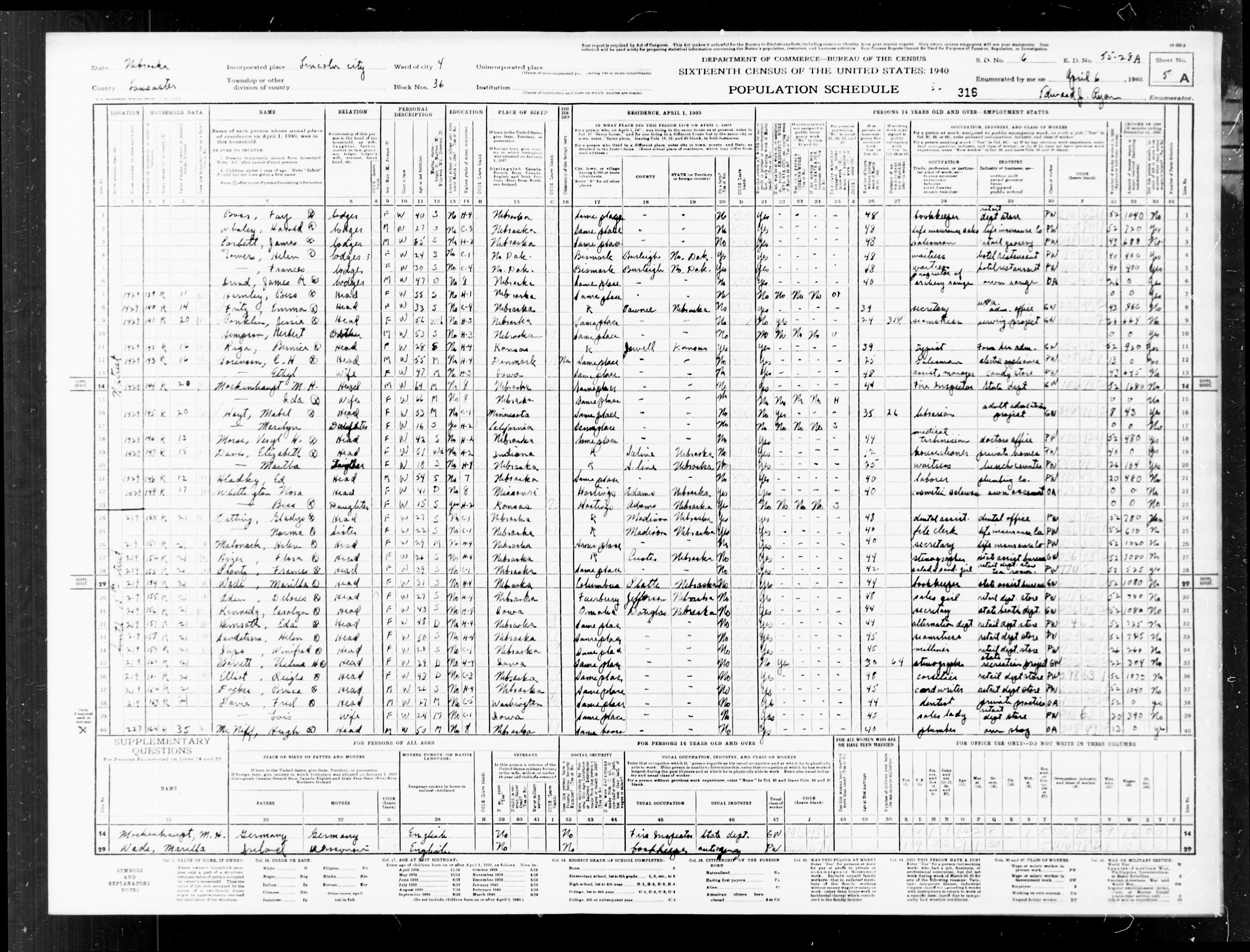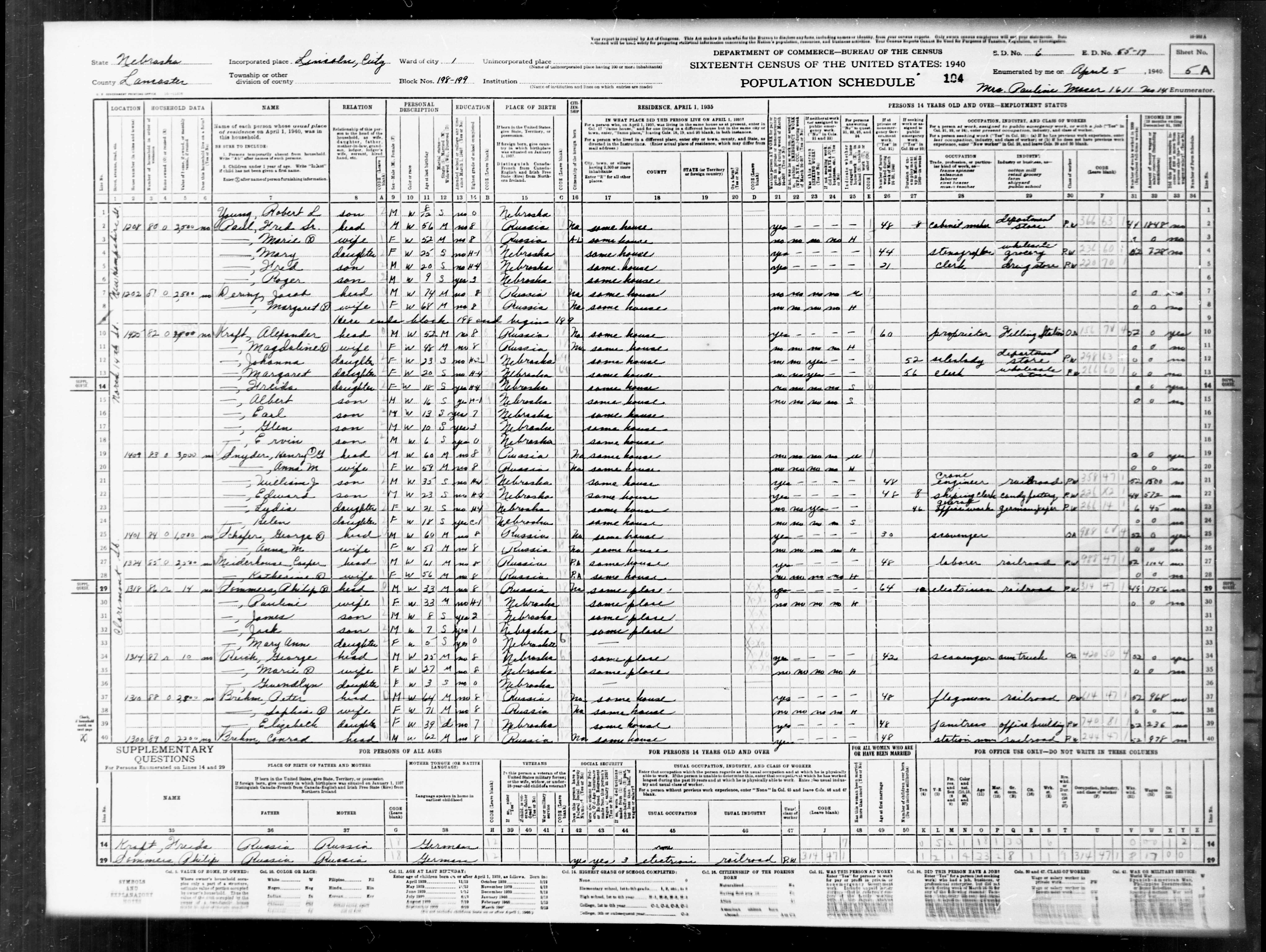 5903. “United States Census: 1940,” Bureau of the Census, US Dept. of Commerce, United States of America, 1940, NE, Lancaster, Lincoln, First Ward, April 5, 1940, Mrs. Pauline Maser, 5A, 6, 55-17, 9.