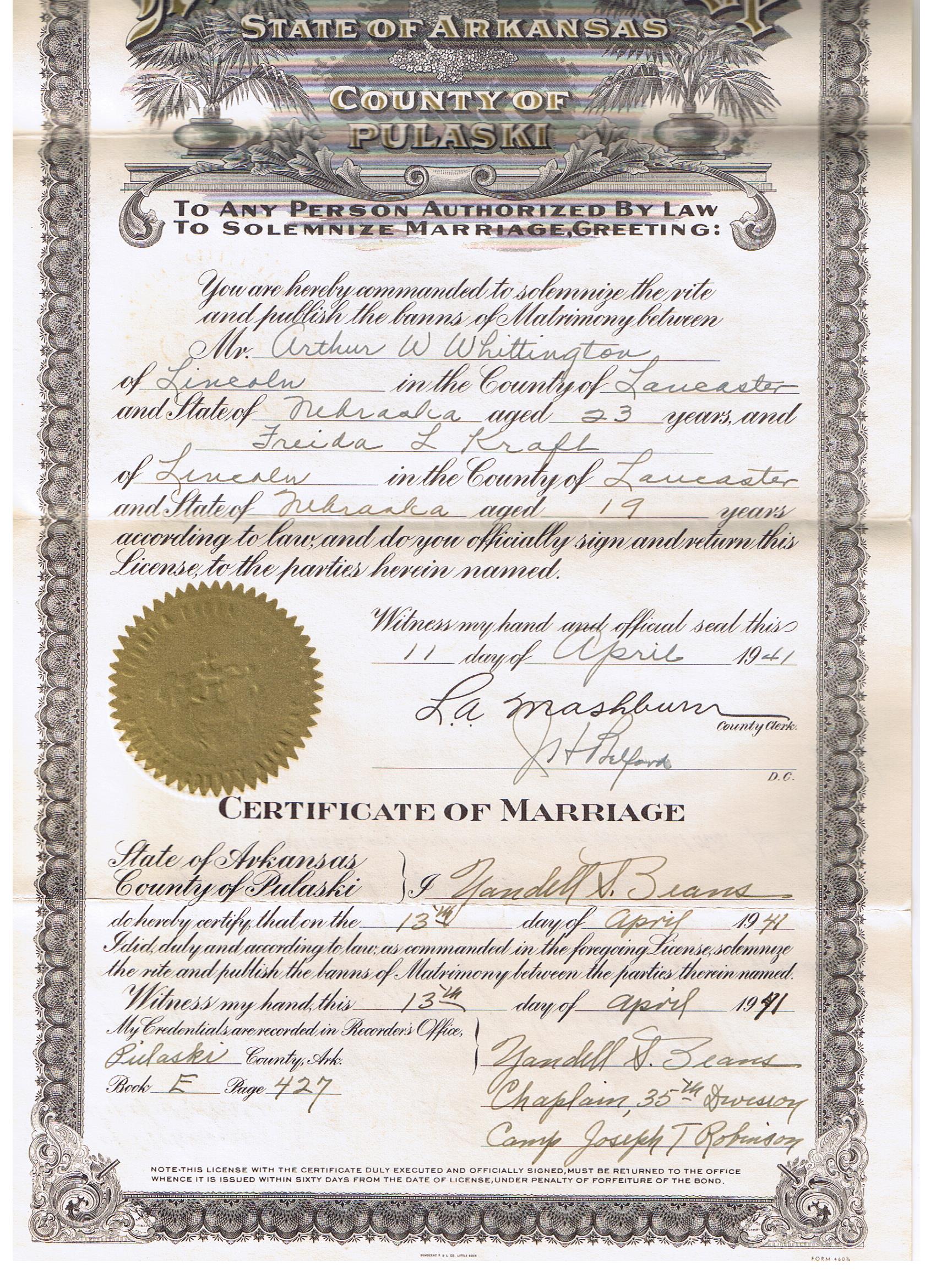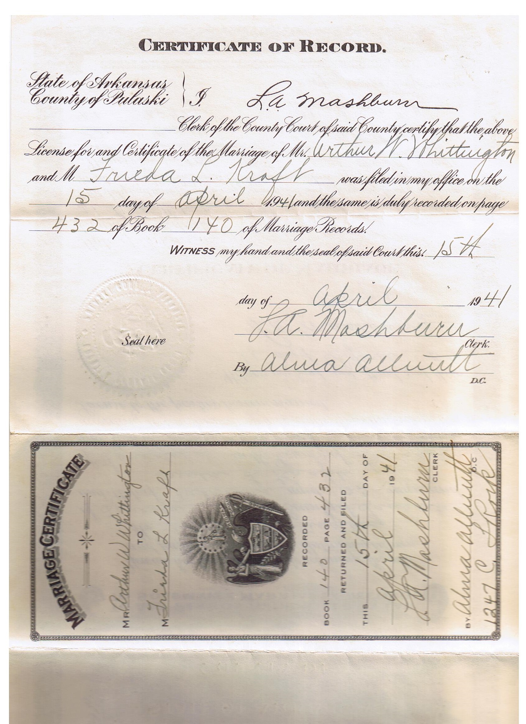 5908. Arthur W Whittington and Frieda L Kraft, “Marriage Certificate,” April 15, 1941, Pulaski County, AR, USA.