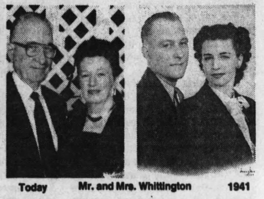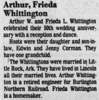 5910. “Anniversaries,” Arthur and Frieda Whittington, Lincoln Journal Star, Lincoln, NE, April 14, 1991, 80.