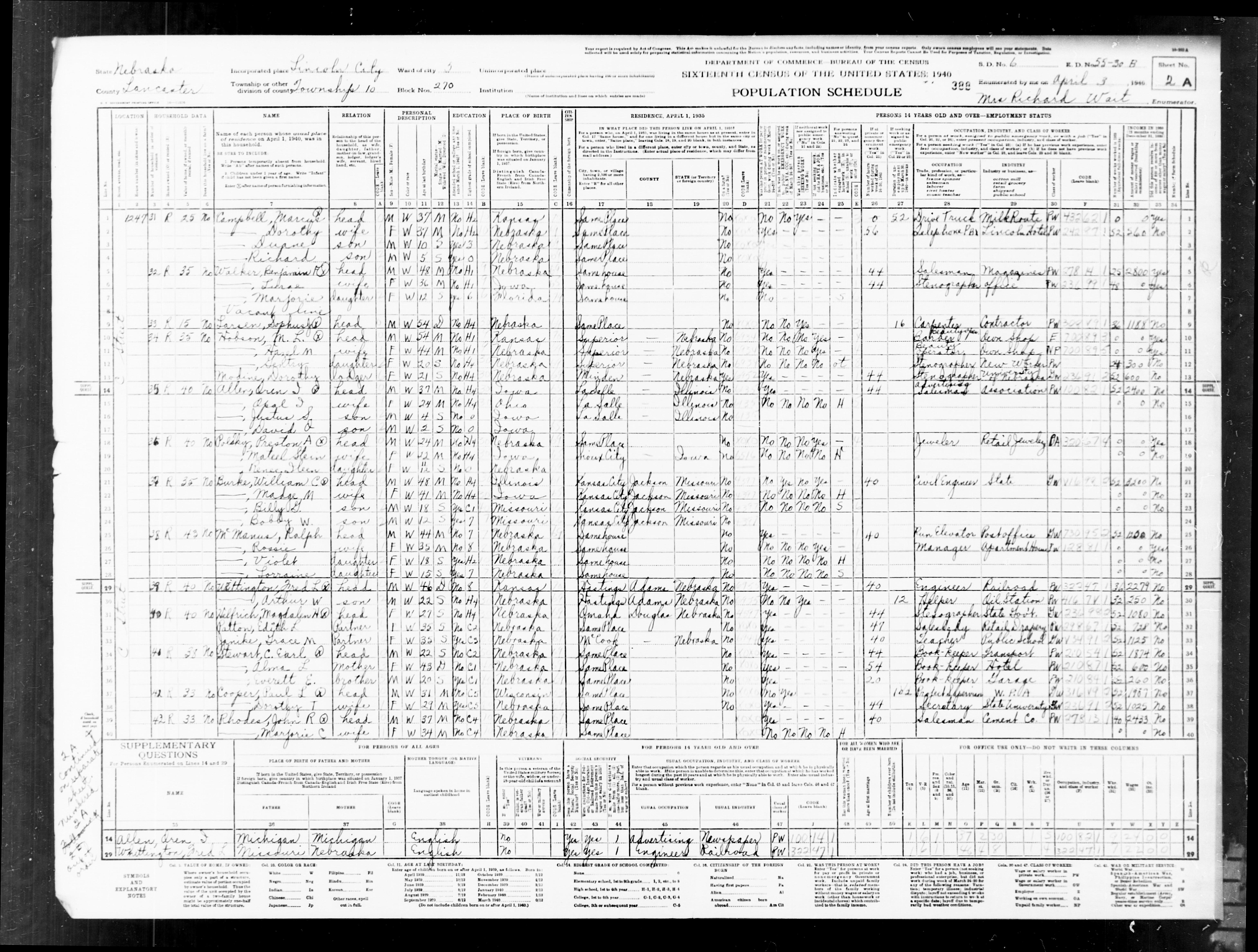 5913. “United States Census: 1940,” Bureau of the Census, US Dept. of Commerce, United States of America, 1940, NE, Lancaster, Lincoln, Ward 5, April 3, 1940, Mrs. Richard Wait, 2A, 6, 55-30 B, T627, 2253, 794.