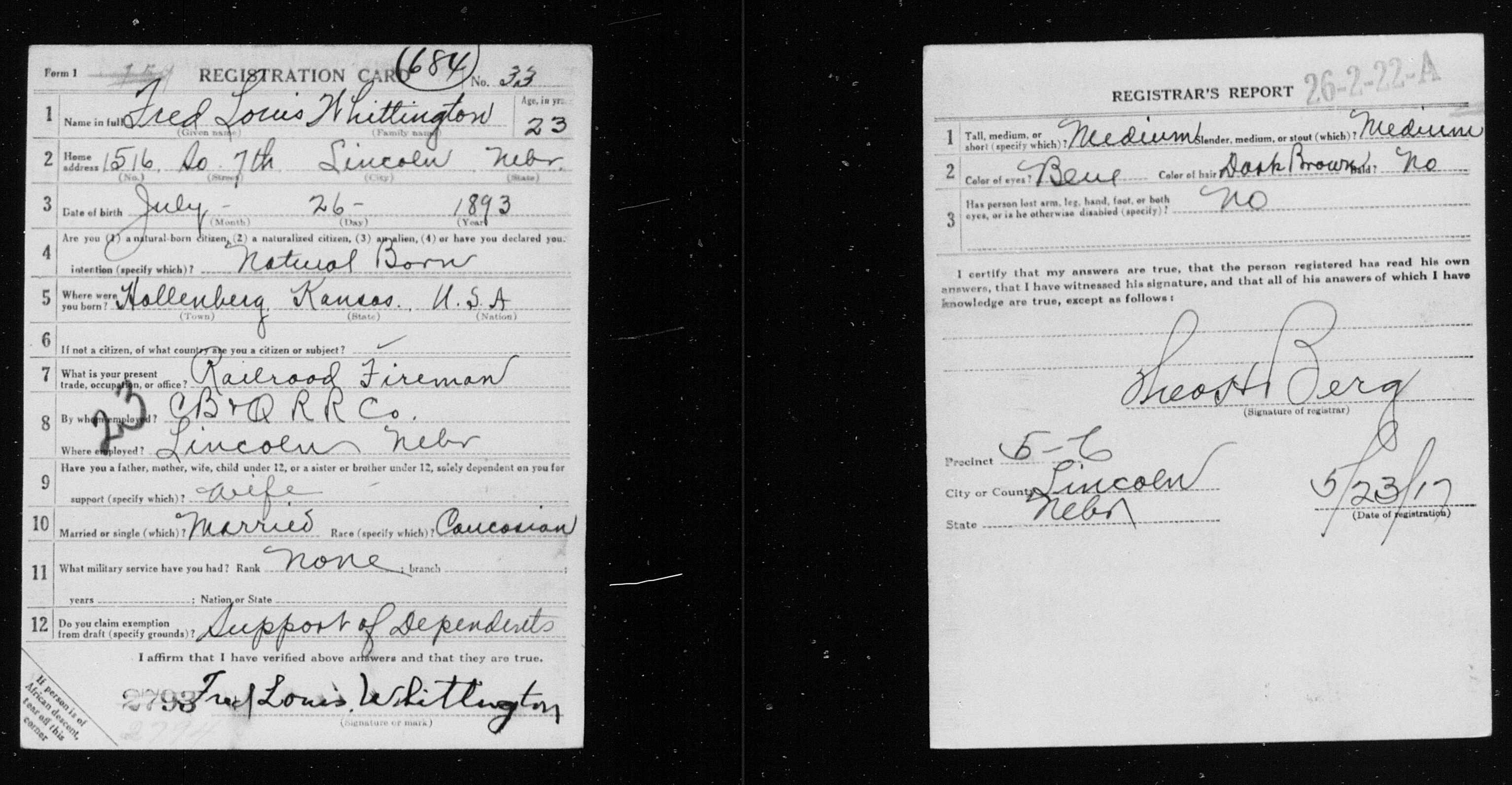 5915. World War I, 1917, Nebraska, 33, Whittington, Fred Louis, “World War I Selective Service System Draft Registration Cards,” May 23, 1917, Lincoln, Lancaster County, NE, Affiliate Publication Number: M1509-GS Film number: 001711703-Digital Folder Number: 005253444-Image Number: 00472, https://familysearch.org/pal:/MM9.1.1/29JN-RT3.