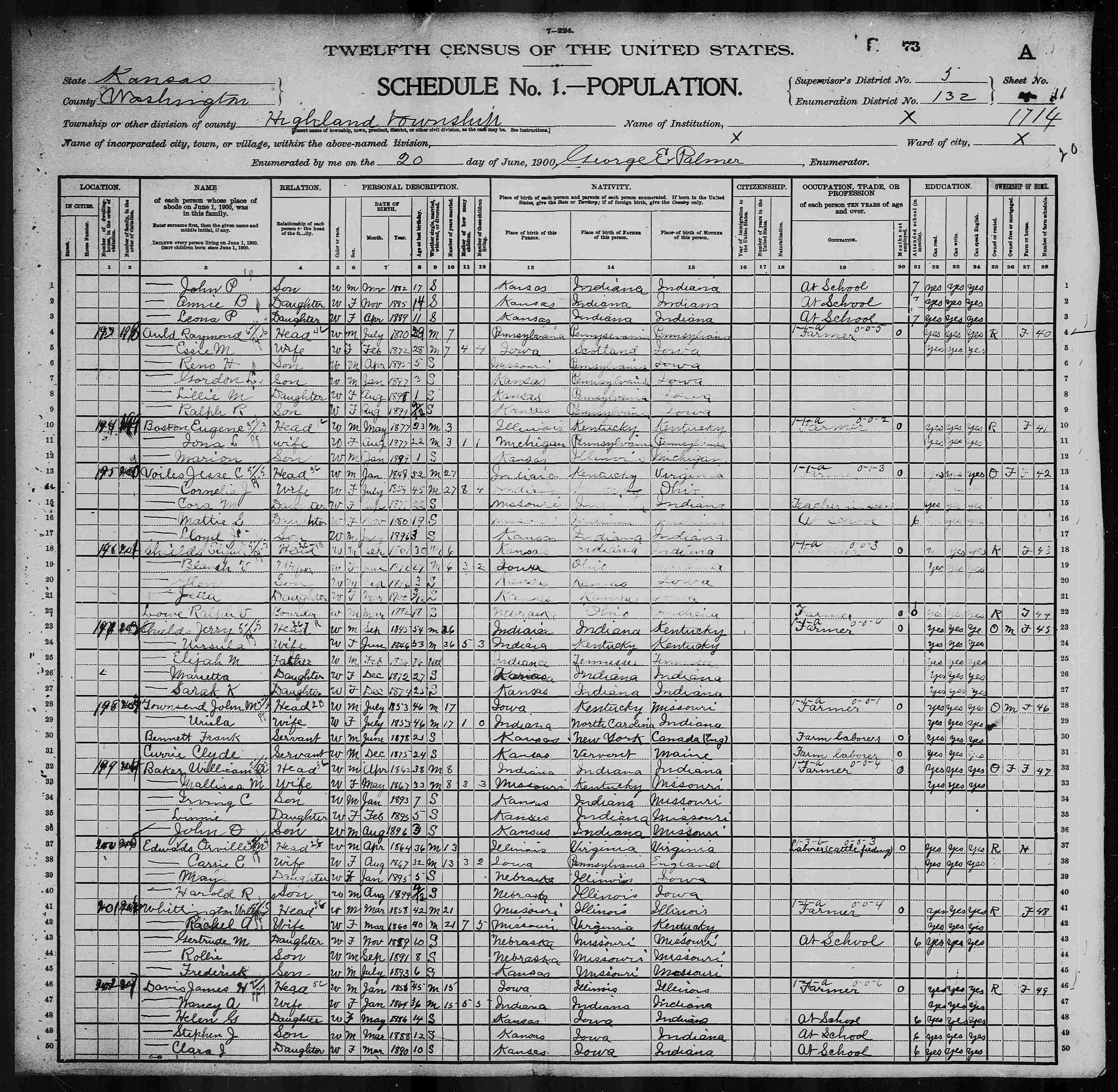 5917. “United States Census: 1900,” Bureau of the Census, US Dept. of Commerce, United States of America, 1900, KS, Washington, Highland Township, June 20, 1900, George E Palmer, 11A, 5, 132, T623, 503, 73, 83.