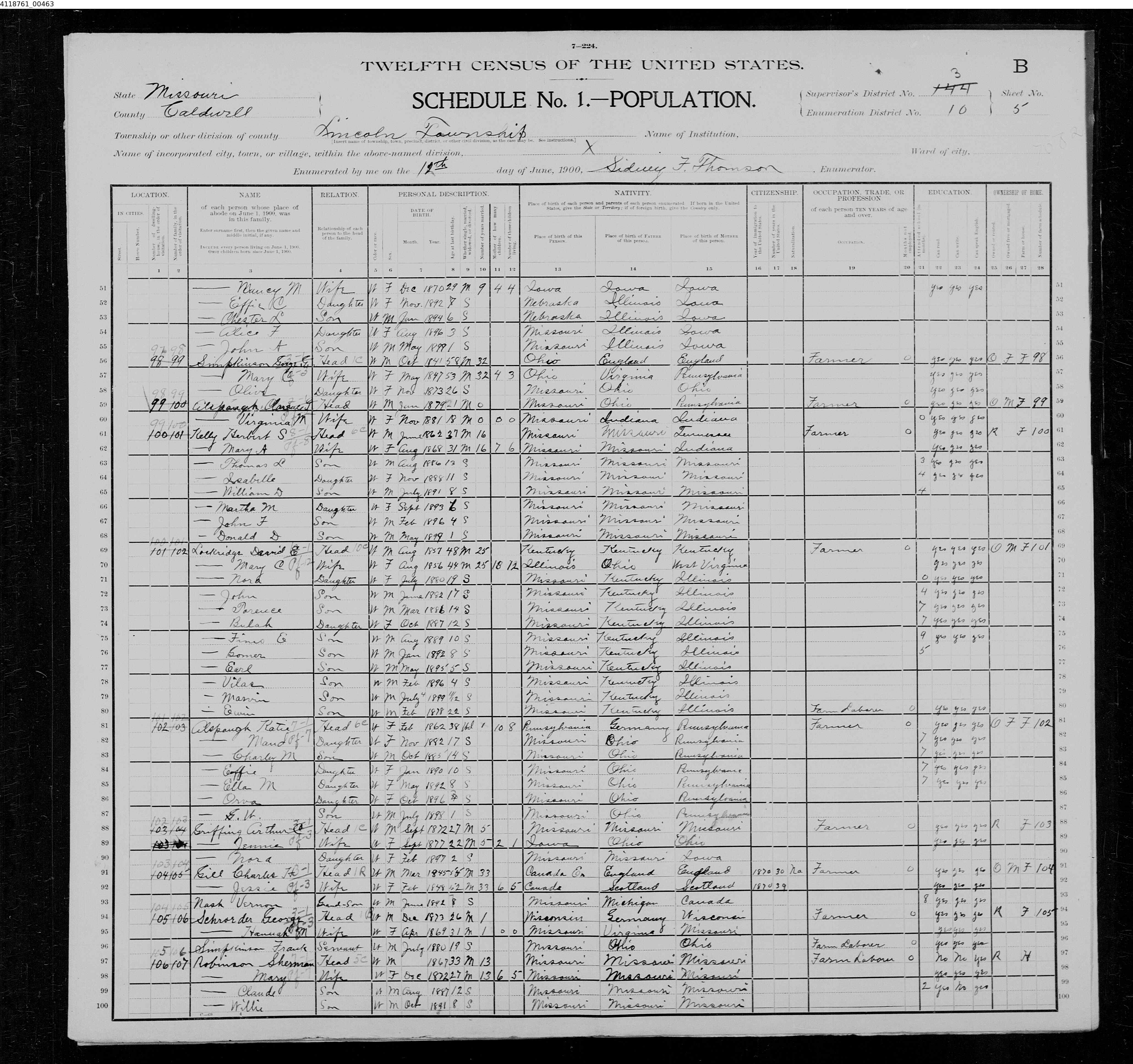 5924. “United States Census: 1900,” Bureau of the Census, US Dept. of Commerce, United States of America, 1900, MO, Caldwell, Lincoln, Cowgill, June 12, 1900, Sidney F Thomson, 5B, 3, 10, T623, 844, 311, 10.