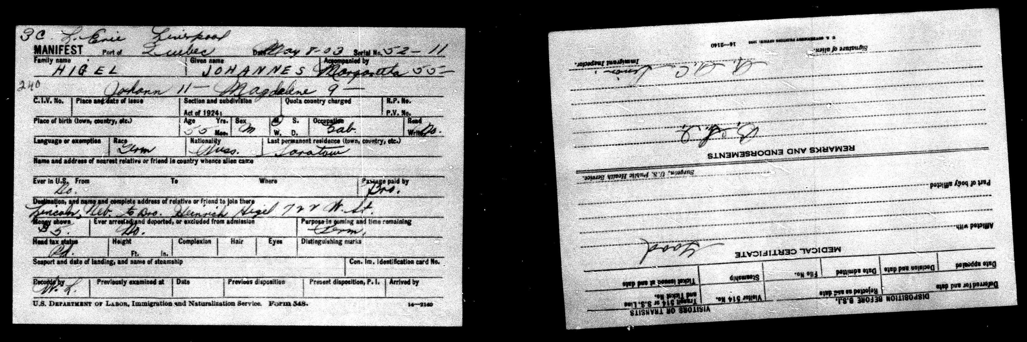 Johannes Higel age 55 born in Russia with last permanent residence in Saratov. Heading to Lincoln, NE to brother Heinrich Higel at 7?? W St. Traveling with wife Margaretha (55), son Johann (11) and daughter Magdalene (9).