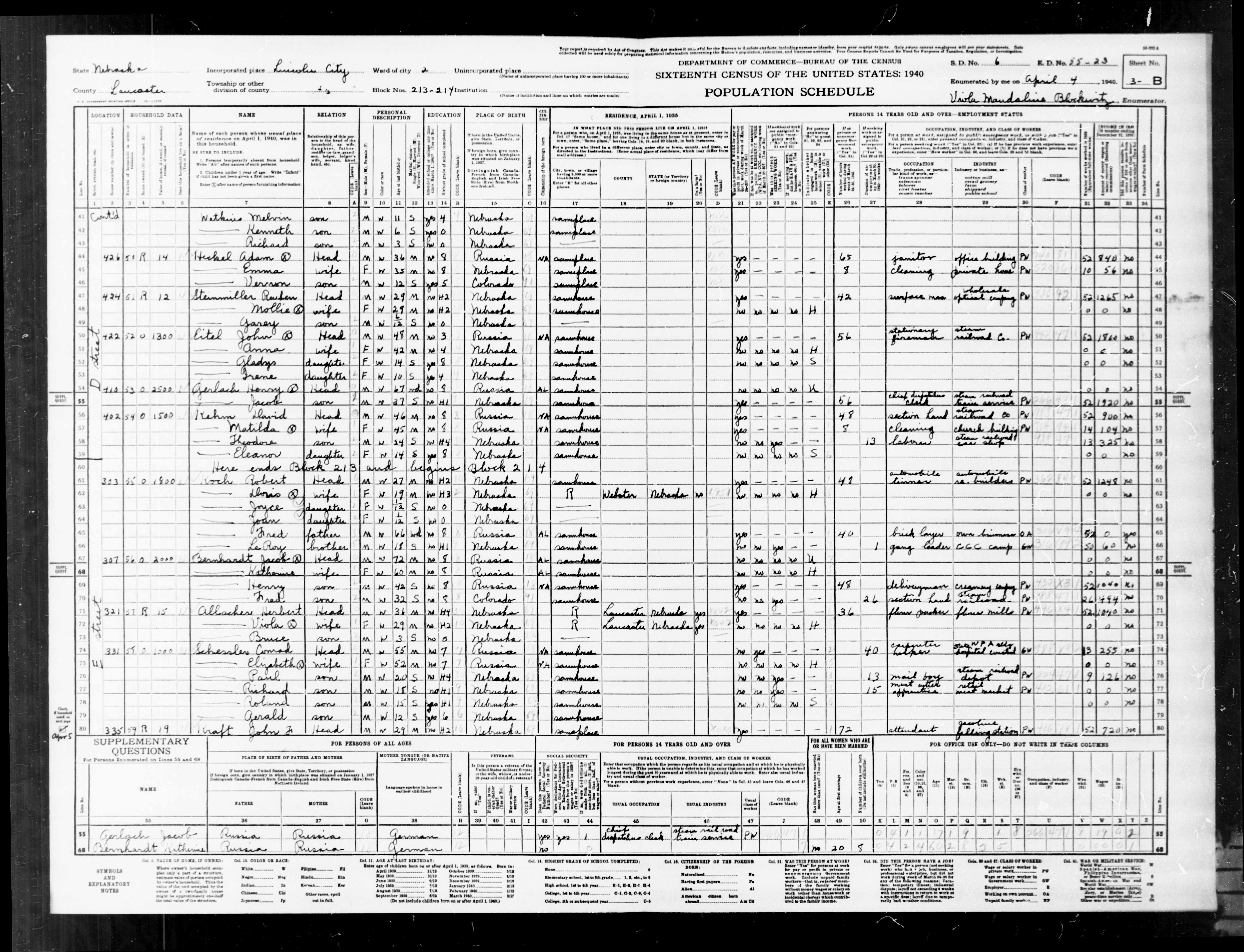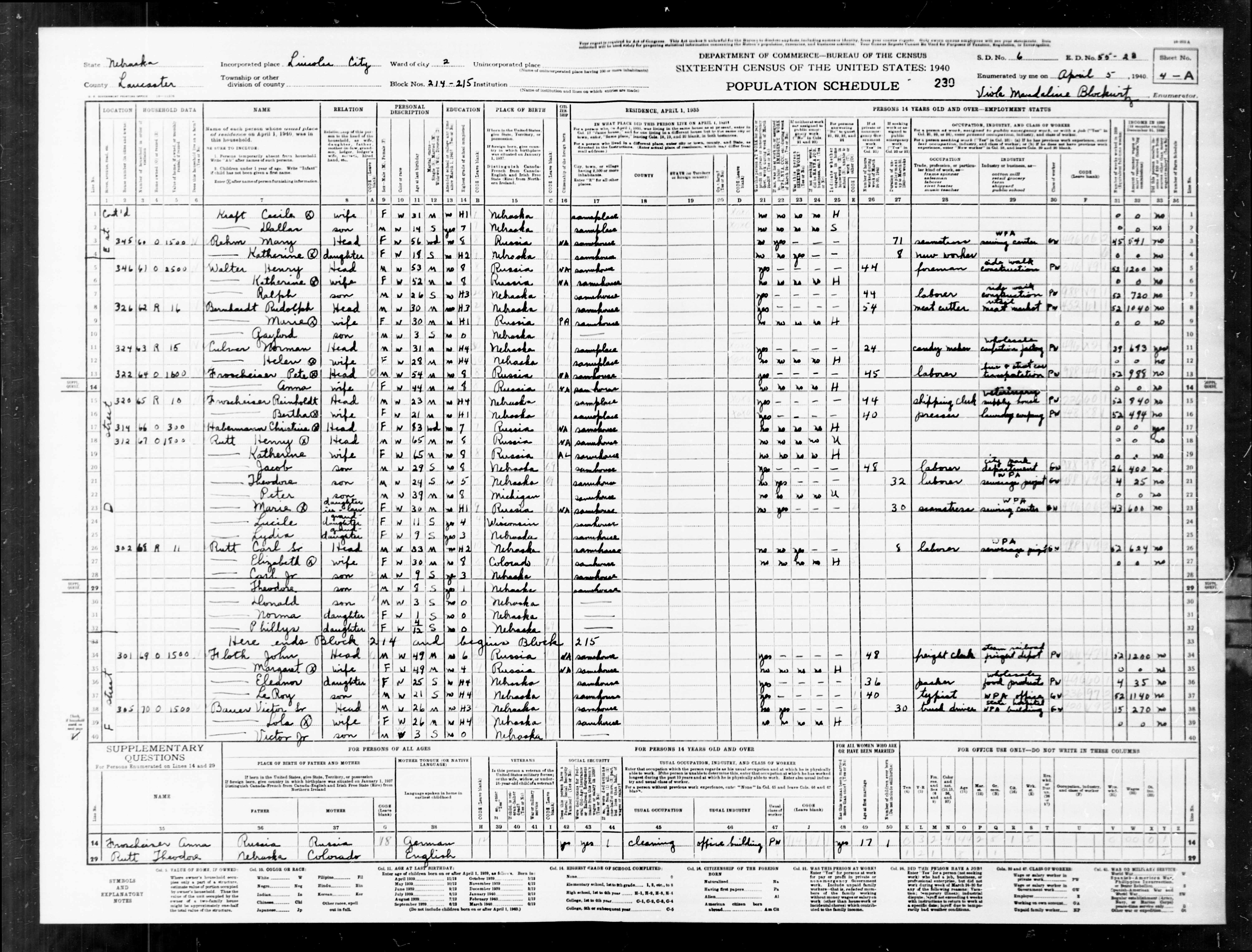 6005. “United States Census: 1940,” US Census Bureau, US Dept. of Commerce, United States of America, 1940, NE, Lancaster, Lincoln, Ward 2, April 5, 1940, Viola Maudaline Brockurtz, 3B-4A, 6, 55-23, T627, 2253, 475.