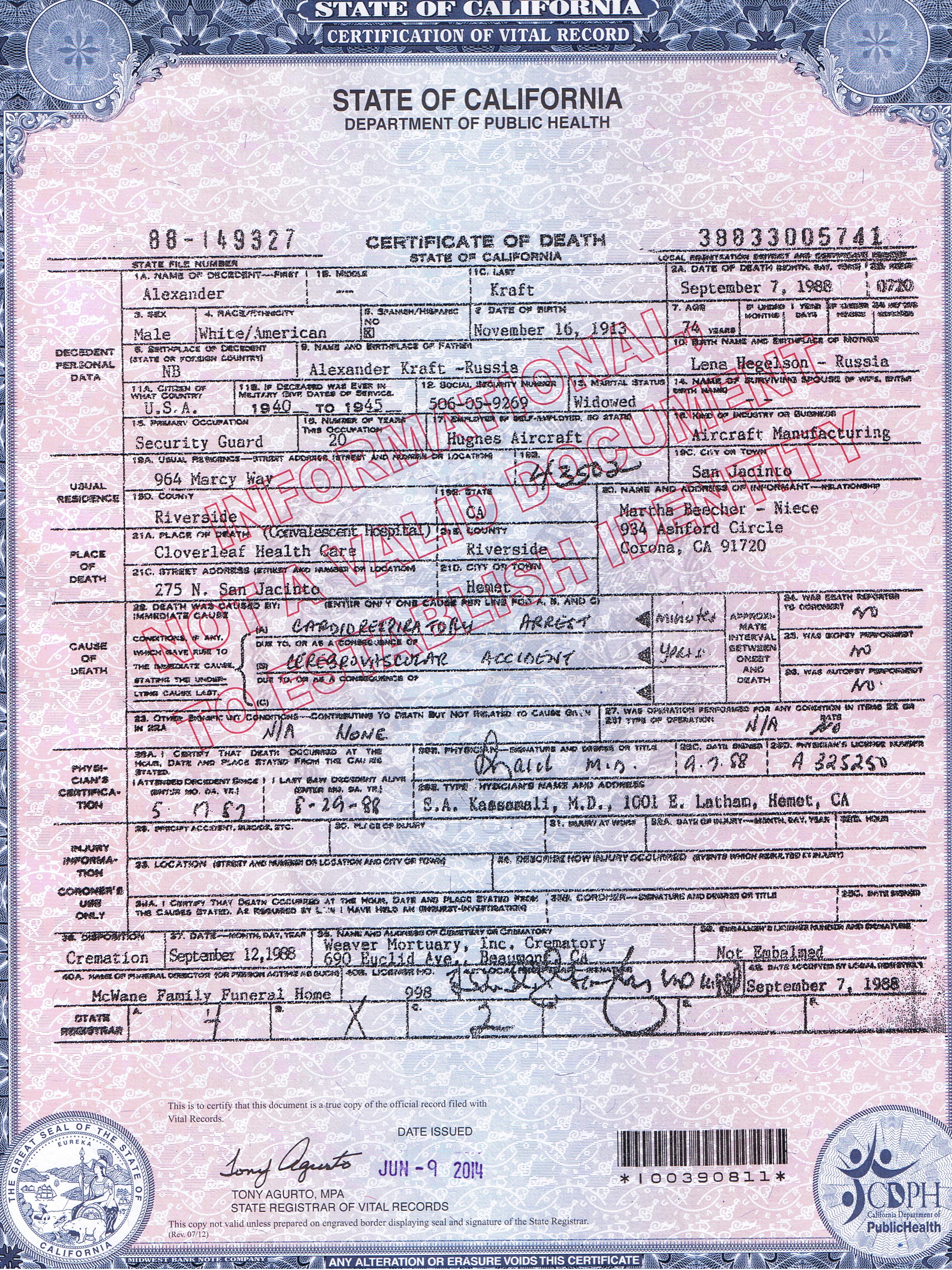 6011. Alexander Kraft, “Certificate of Death,” September 7, 1988, Cloverleaf Health Care, 275 N. San Jacinto, Hemet, Riverside County, CA, USA, 38833005741.