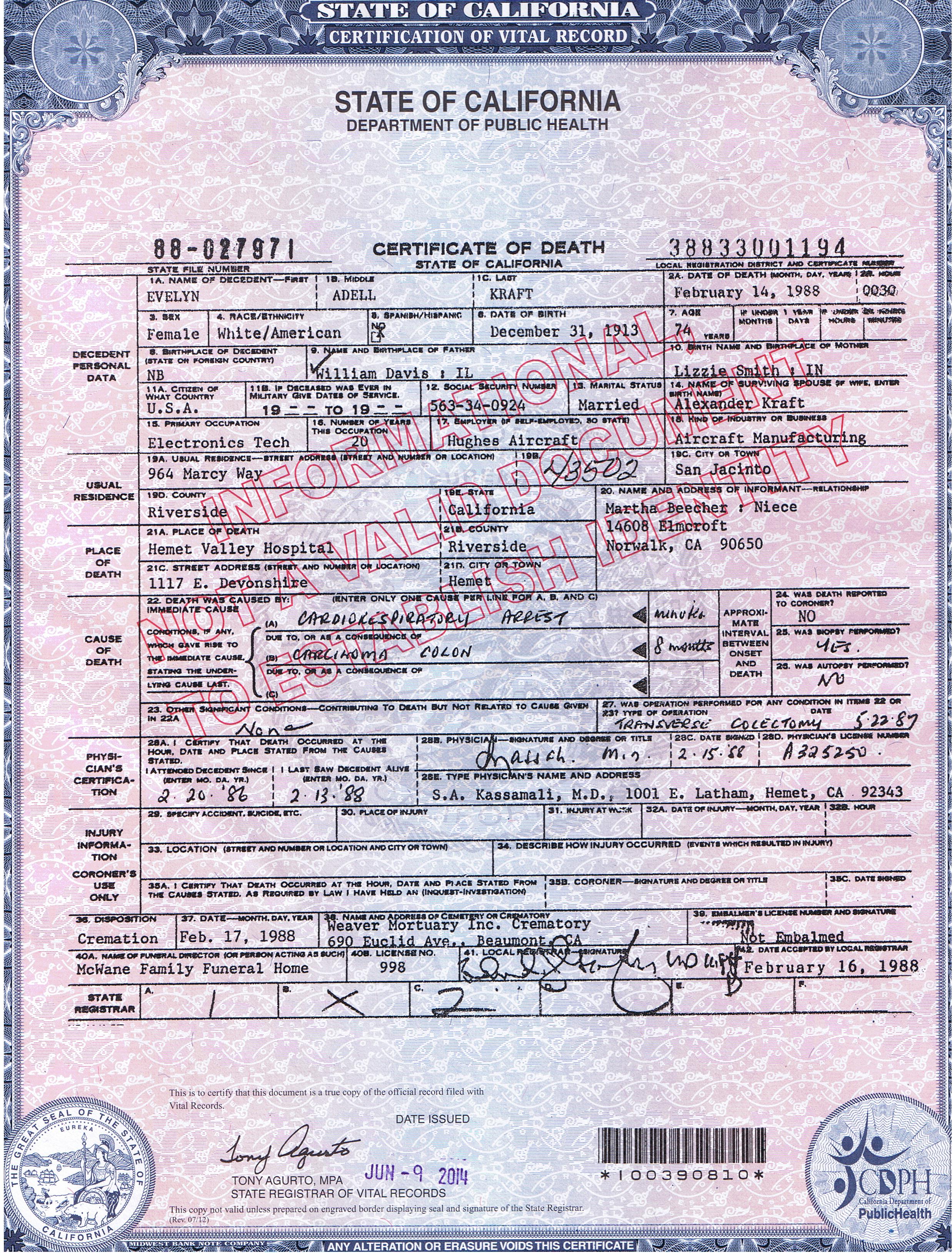 6015. Evelyn Adell Kraft, “Certificate of Death,” February 14, 1988, Hemet Valley Hospital, 1117 E. Devonshire, Hemet, Riverside County, CA, USA, 38833001194.