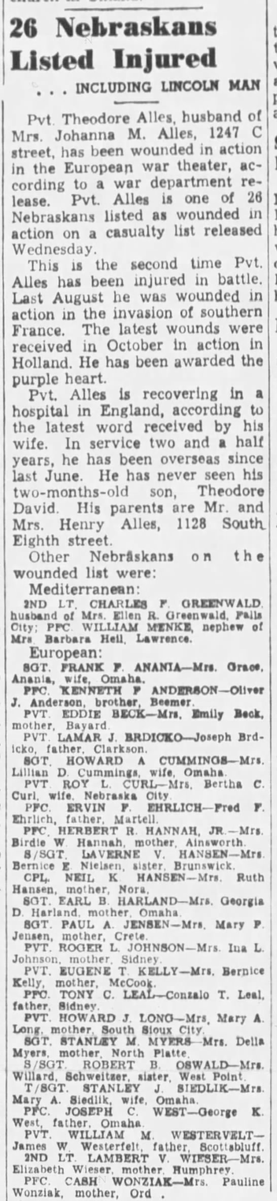 6021. “26 Nebraskans Listed Injured .. Including Lincoln Man,” Theodore Alles, The Lincoln Star, Lincoln, NE, January 10, 1945, 7.
