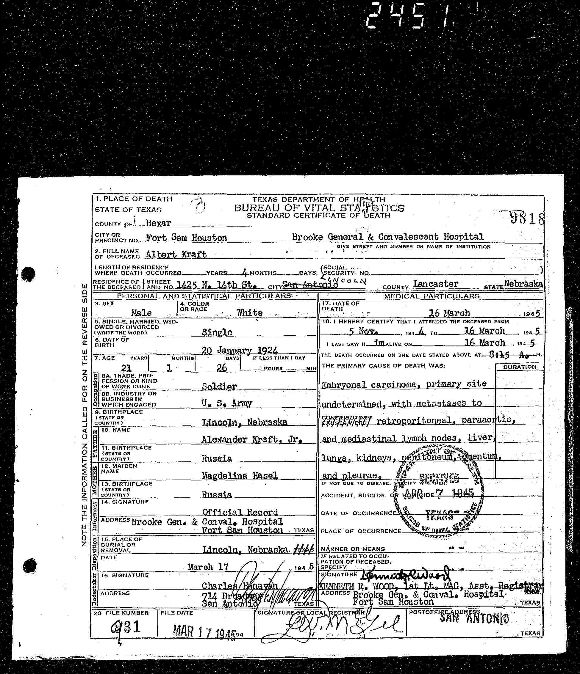 Cpl. Albert Kraft, 21, son of Mr. and Mrs. Alex Kraft, 1425 No. 14th, died at Brooke General hospital at San Antonio, Tex., March 16, 1945. He was a native of Lincoln and attended Lincoln high school. Previous to his entering the armed forces he had worked as an attendant at his father’s service station.