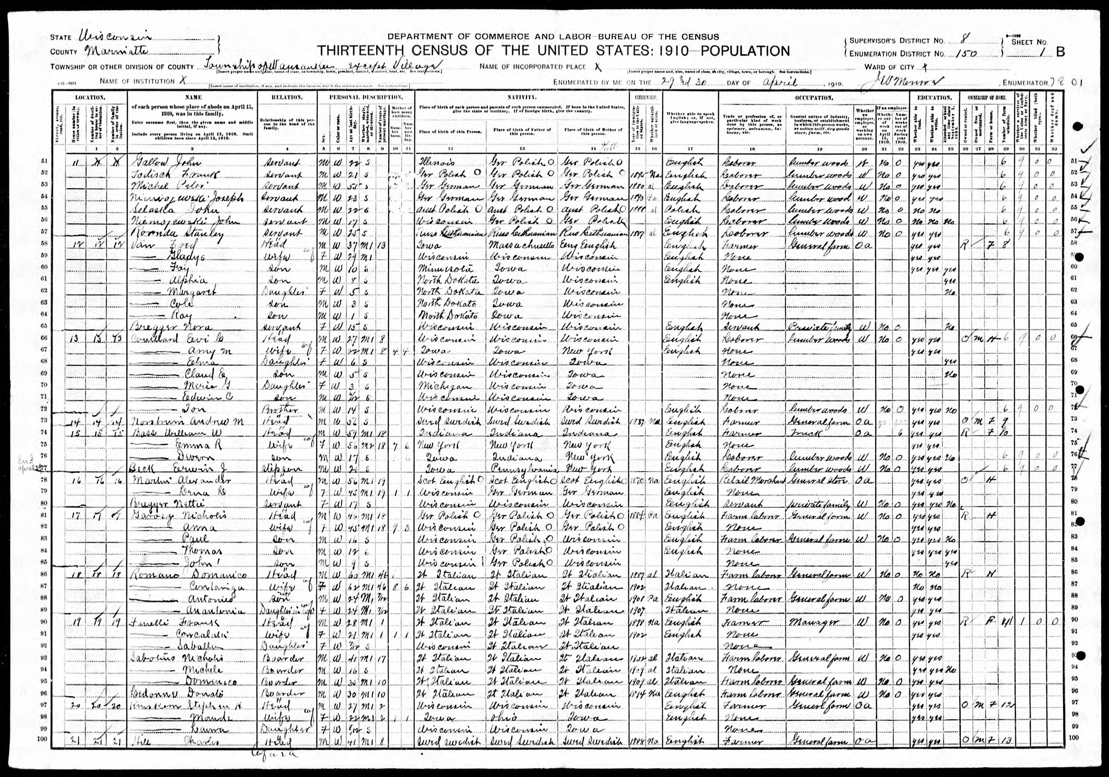 6155. “United States Census,” 1910, WI, Marinette, Wausaukee, 1B, 8, 150, T624, 1717, Bureau of the Census, US Dept. of Commerce, United States of America, April 29, 1910, J W Mermon.