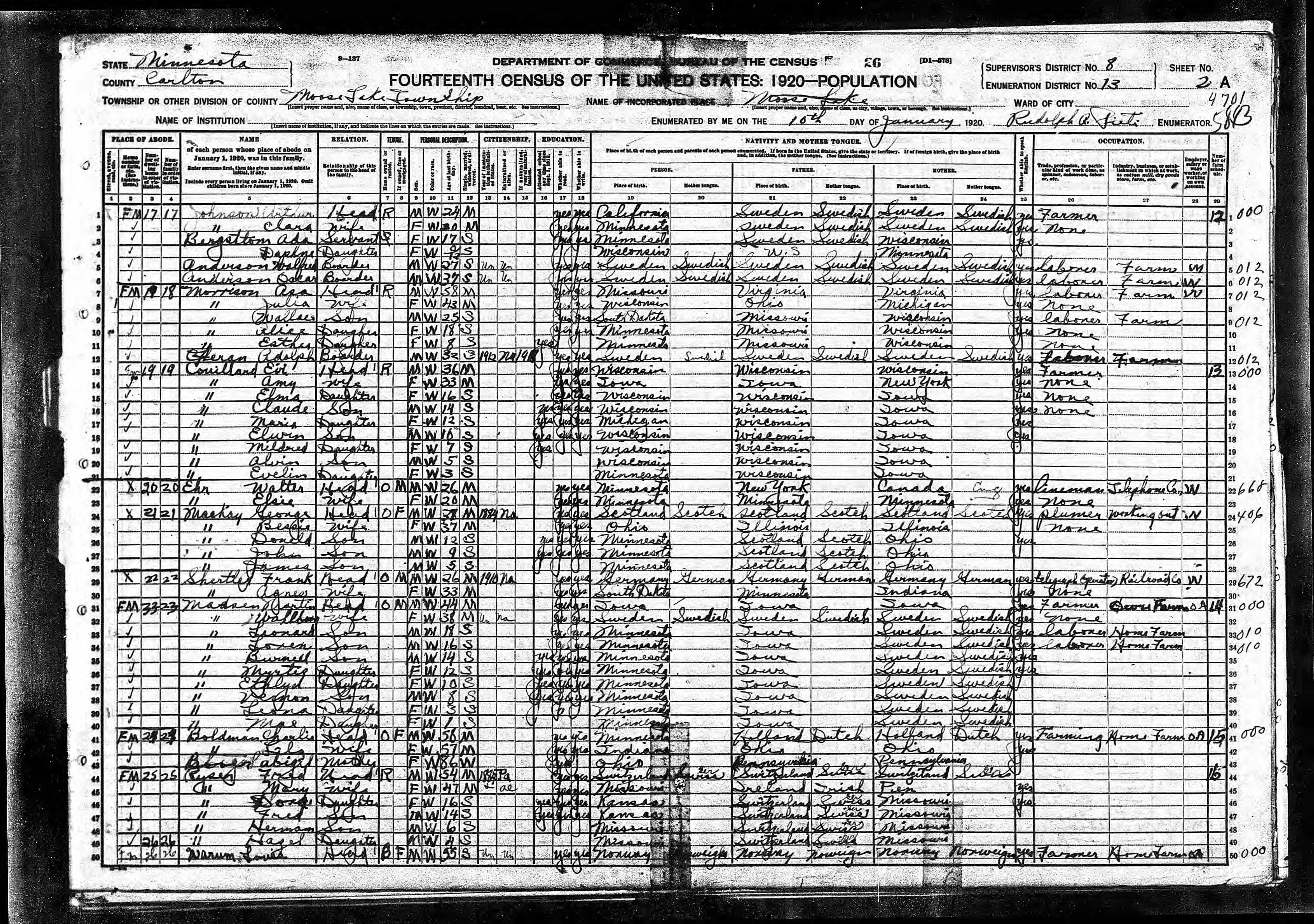 6156. “United States Census,” 1920, MN, Carlton, Moose Lake, 2A, 8, 13, T625, 824, 637, Bureau of the Census, US Dept. of Commerce, United States of America, January 10, 1920, Rudolph R Pieti.