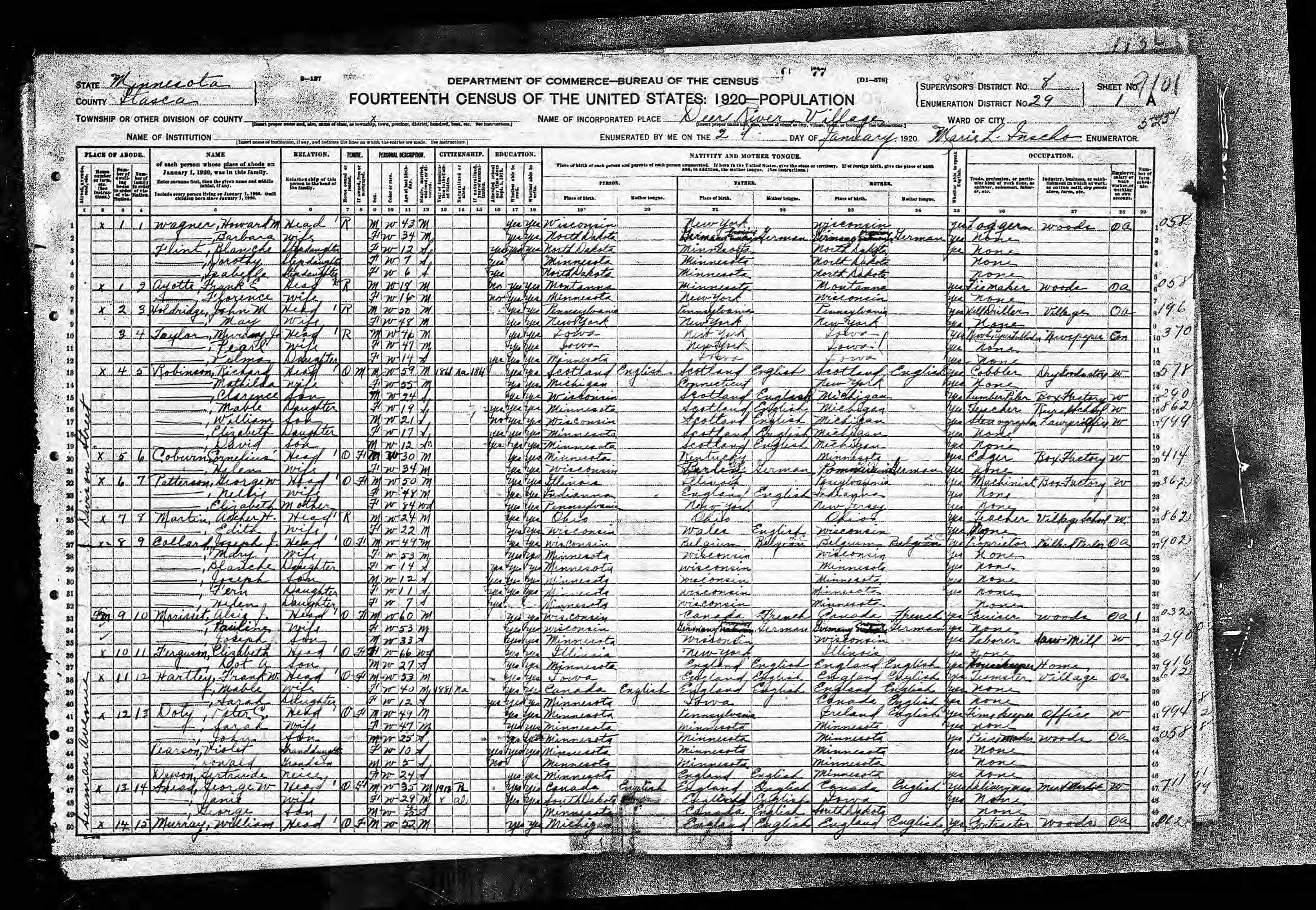 6162. “United States Census,” 1920, MN, Itasca, Deer River, 1A, 8, 29, T625, 840, 705, Bureau of the Census, US Dept. of Commerce, United States of America, January 2, 1920, Marie L Inscho.