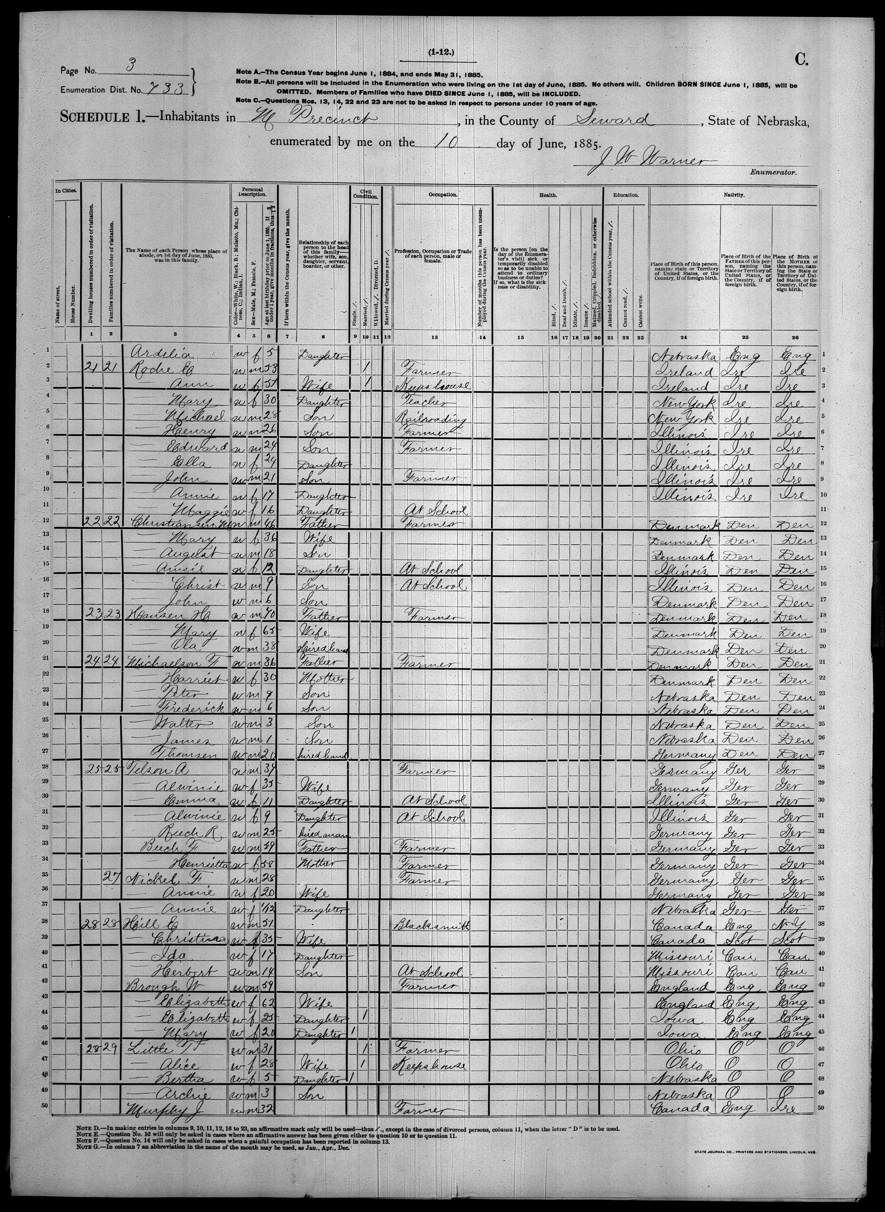 6167. “Nebraska State Census,” 1885, NE, Seward, M Precinct, 3C, 733, M352, 499,579, June 10, 1885, J W Warner.