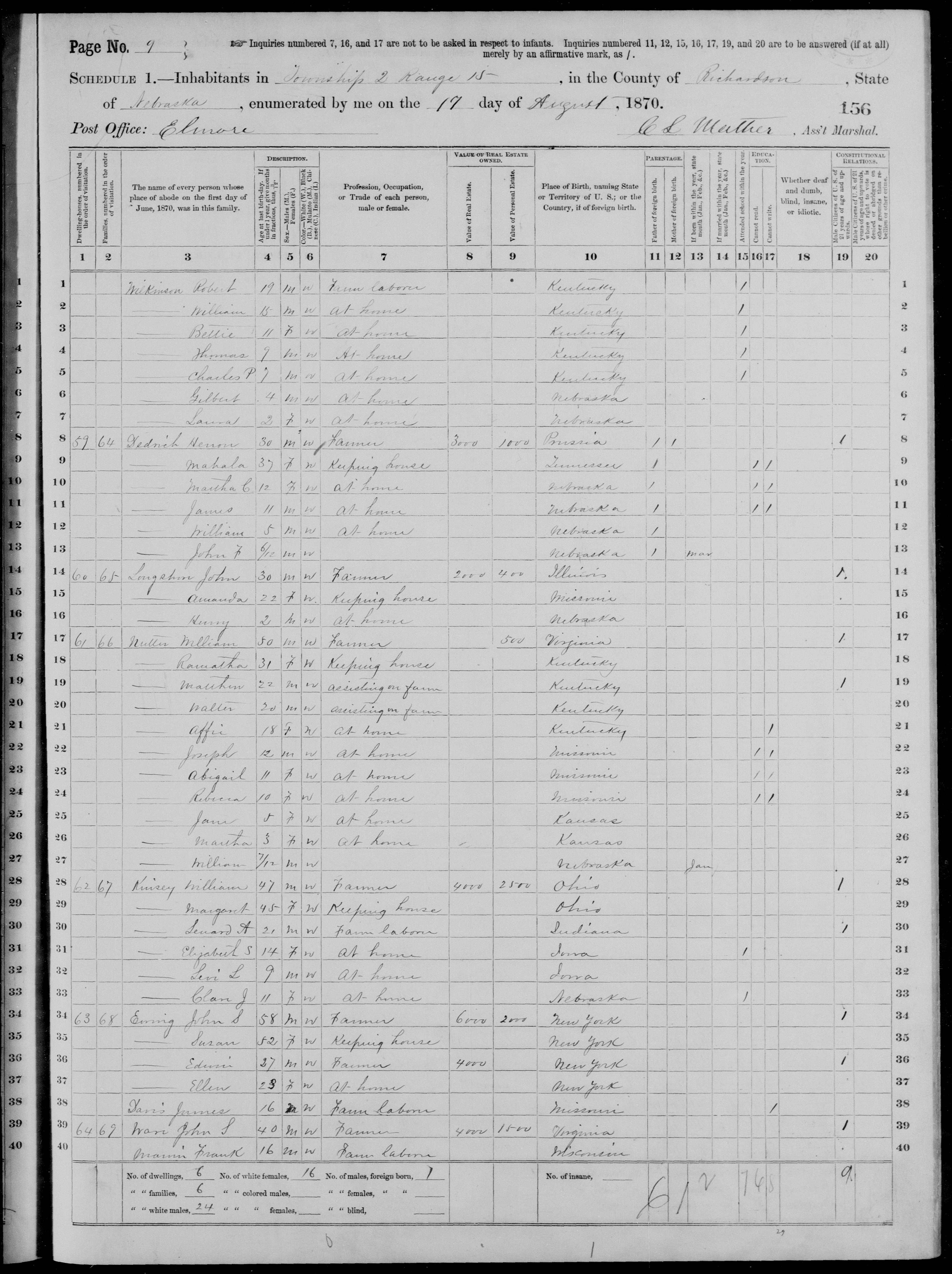 6178. “Ninth Census of the United States. Schedule No. 1.--Population,” Bureau of the Census, US Dept. of Commerce, United States of America, 1870, NE, Richardson, Township 2 Range 15, Elmore, August 17, 1870, C S Mather, 156, M593, 552331, 9.