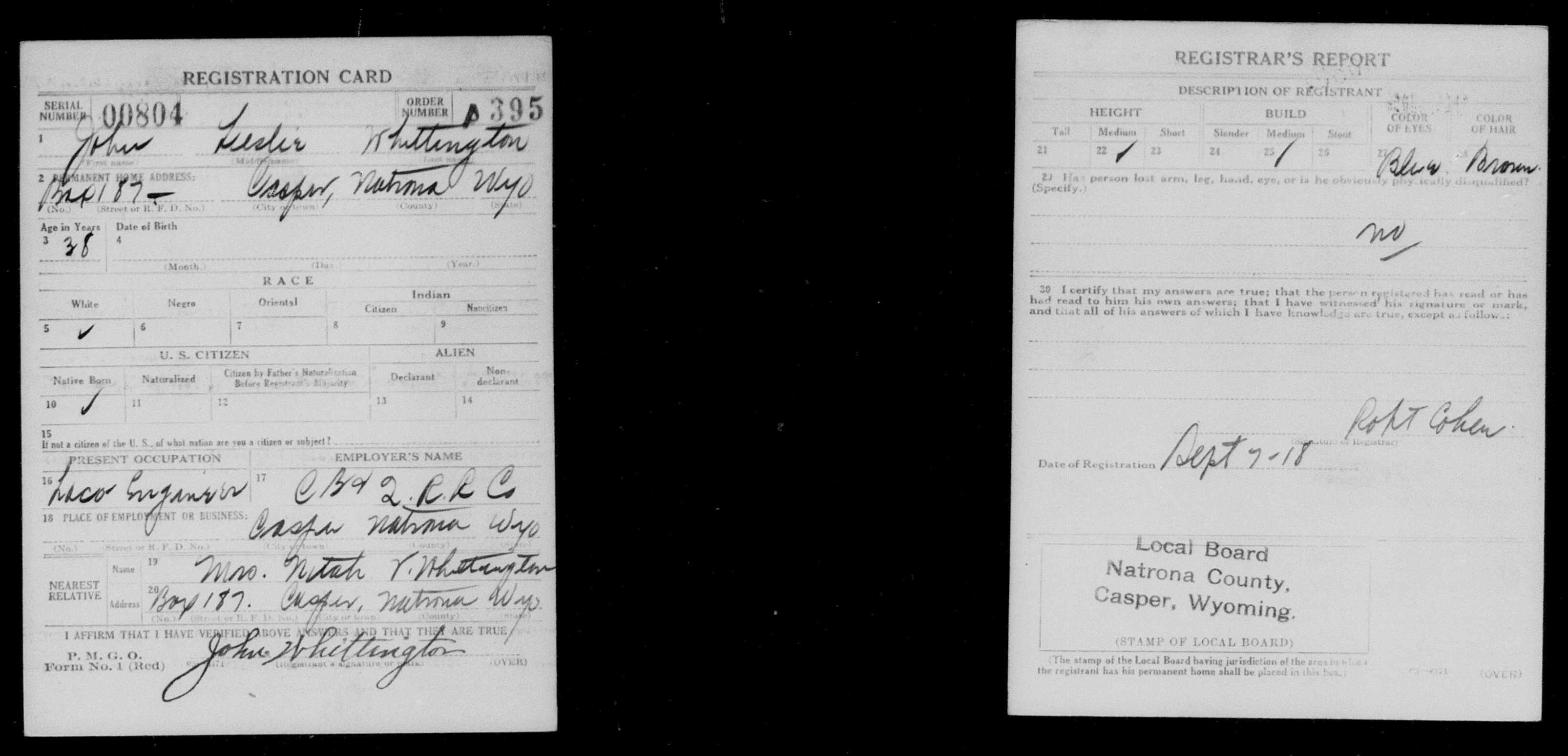 6193. World War I, 1918, Wyoming, 00804, Whittington, John Leslie, “World War I Selective Service System Draft Registration Cards,” September 7, 1918, Casper, Natrona County, WY, USA, Affiliate Publication Number: M1509 , GS Film Number: 002022243 , Digital Folder Number: 005245828 , Image Number: 00515, https://familysearch.org/ark:/61903/1:1:K687-ZJQ, Lists his name as John Leslie Whittington.